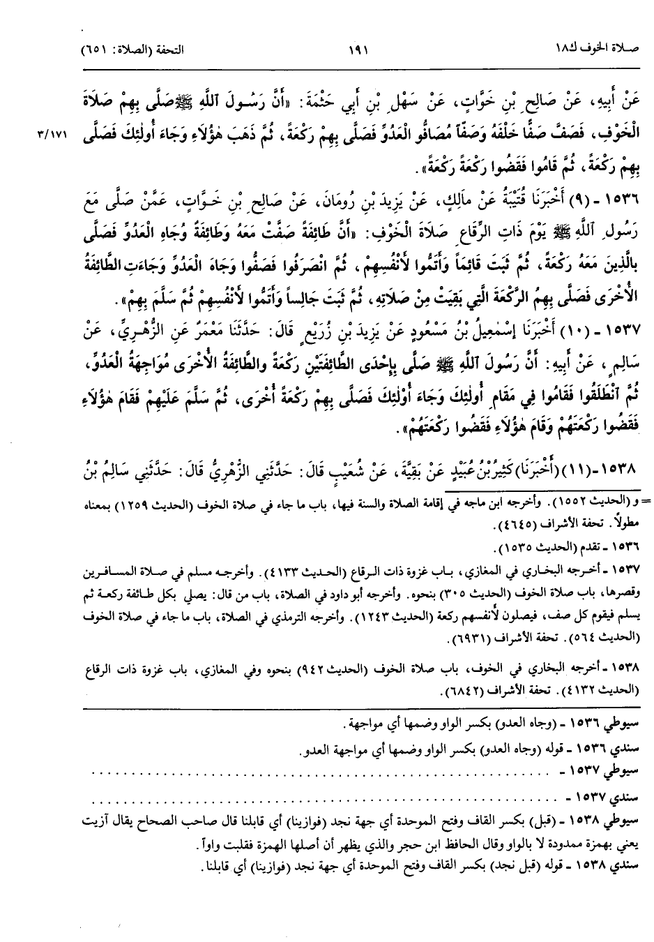 1538 - أَخْبَرَنِي كَثِيرُ بْنُ عُبَيْدٍ عَنْ بَقِيَّةَ عَنْ شُعَيْبٍ قَالَ حَدَّثَنِي الزُّهْرِيُّ قَالَ حَدَّثَنِي سَالِمُ بْنُ عَبْدِ اللَّهِ عَنْ أَبِيهِ قَالَ غَزَوْتُ مَعَ رَسُولِ اللَّهِ صَلَّى اللَّهُ عَلَيْهِ وَسَلَّمَ قِبَلَ نَجْدٍ فَوَازَيْنَا الْعَدُوَّ وَصَافَفْنَاهُمْ فَقَامَ رَسُولُ اللَّهِ صَلَّى اللَّهُ عَلَيْهِ وَسَلَّمَ يُصَلِّي بِنَا فَقَامَتْ طَائِفَةٌ مِنَّا مَعَهُ وَأَقْبَلَ طَائِفَةٌ عَلَى الْعَدُوِّ فَرَكَعَ رَسُولُ اللَّهِ صَلَّى اللَّهُ عَلَيْهِ وَسَلَّمَ وَمَنْ مَعَهُ رَكْعَةً وَسَجَدَ سَجْدَتَيْنِ ثُمَّ انْصَرَفُوا فَكَانُوا مَكَانَ أُولَئِكَ الَّذِينَ لَمْ يُصَلُّوا وَجَاءَتْ الطَّائِفَةُ الَّتِي لَمْ تُصَلِّ فَرَكَعَ بِهِمْ رَكْعَةً وَسَجْدَتَيْنِ ثُمَّ سَلَّمَ رَسُولُ اللَّهِ صَلَّى اللَّهُ عَلَيْهِ وَسَلَّمَ فَقَامَ كُلُّ رَجُلٍ مِنْ الْمُسْلِمِينَ فَرَكَعَ لِنَفْسِهِ رَكْعَةً وَسَجْدَتَيْنِ