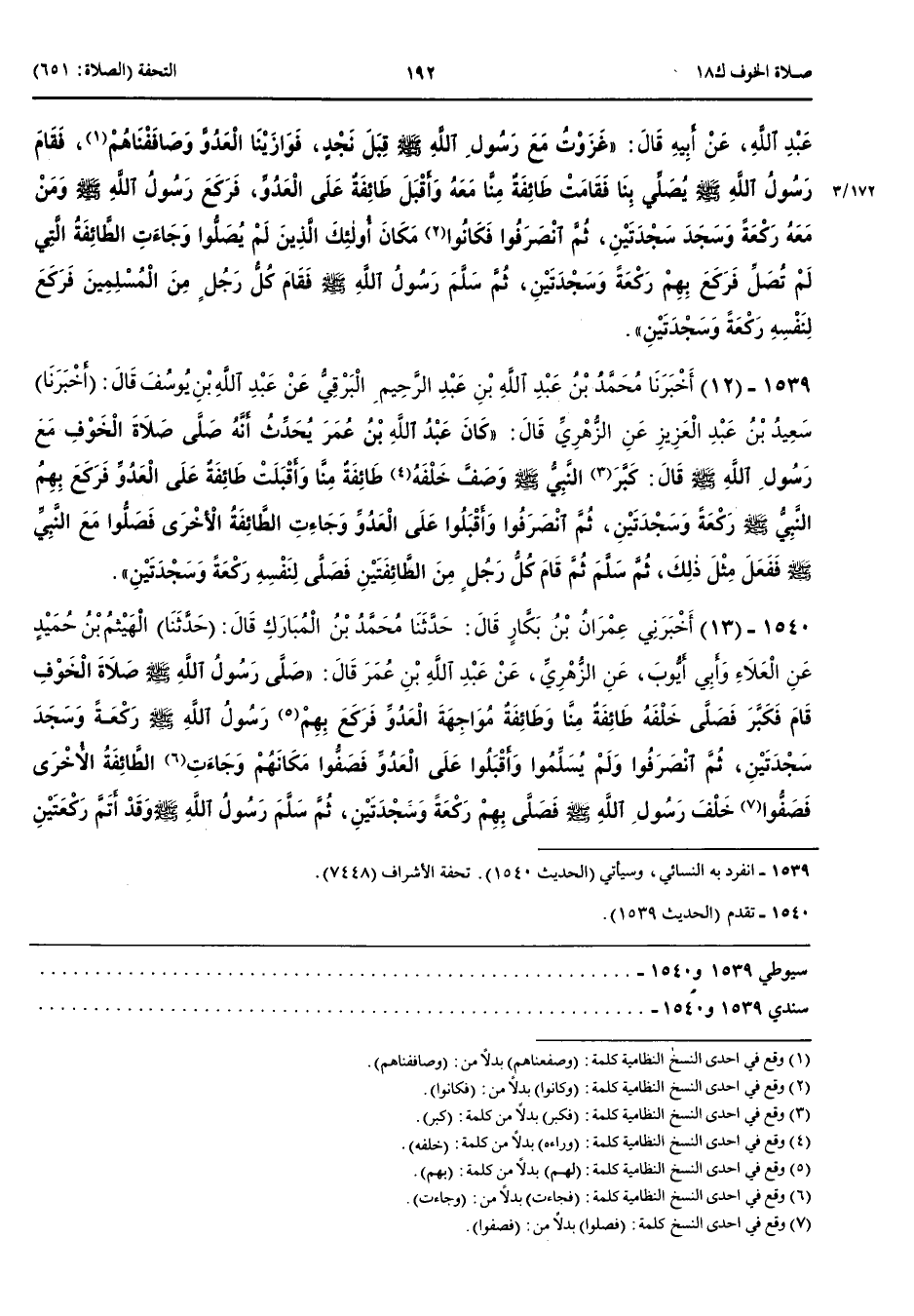 1540 - أَخْبَرَنِي عِمْرَانُ بْنُ بَكَّارٍ قَالَ حَدَّثَنَا مُحَمَّدُ بْنُ الْمُبَارَكِ قَالَ أَنْبَأَنَا الْهَيْثَمُ بْنُ حُمَيْدٍ عَنْ الْعَلَاءِ وَأَبِي أَيُّوبَ عَنْ الزُّهْرِيِّ عَنْ عَبْدِ اللَّهِ بْنِ عُمَرَ قَالَ صَلَّى رَسُولُ اللَّهِ صَلَّى اللَّهُ عَلَيْهِ وَسَلَّمَ صَلَاةَ الْخَوْفِ قَامَ فَكَبَّرَ فَصَلَّى خَلْفَهُ طَائِفَةٌ مِنَّا وَطَائِفَةٌ مُوَاجِهَةَ الْعَدُوِّ فَرَكَعَ بِهِمْ رَسُولُ اللَّهِ صَلَّى اللَّهُ عَلَيْهِ وَسَلَّمَ رَكْعَةً وَسَجَدَ سَجْدَتَيْنِ ثُمَّ انْصَرَفُوا وَلَمْ يُسَلِّمُوا وَأَقْبَلُوا عَلَى الْعَدُوِّ فَصَفُّوا مَكَانَهُمْ وَجَاءَتْ الطَّائِفَةُ الْأُخْرَى فَصَفُّوا خَلْفَ رَسُولِ اللَّهِ صَلَّى اللَّهُ عَلَيْهِ وَسَلَّمَ فَصَلَّى بِهِمْ رَكْعَةً وَسَجْدَتَيْنِ ثُمَّ سَلَّمَ رَسُولُ اللَّهِ صَلَّى اللَّهُ عَلَيْهِ وَسَلَّمَ وَقَدْ أَتَمَّ رَكْعَتَيْنِ وَأَرْبَعَ سَجَدَاتٍ ثُمَّ قَامَتْ الطَّائِفَتَانِ فَصَلَّى كُلُّ إِنْسَانٍ مِنْهُمْ لِنَفْسِهِ رَكْعَةً وَسَجْدَتَيْنِ قَالَ أَبُو بَكْرِ بْنُ السُّنِّيِّ الزُّهْرِيُّ سَمِعَ مِنْ ابْنِ عُمَرَ حَدِيثَيْنِ وَلَمْ يَسْمَعْ هَذَا مِنْهُ