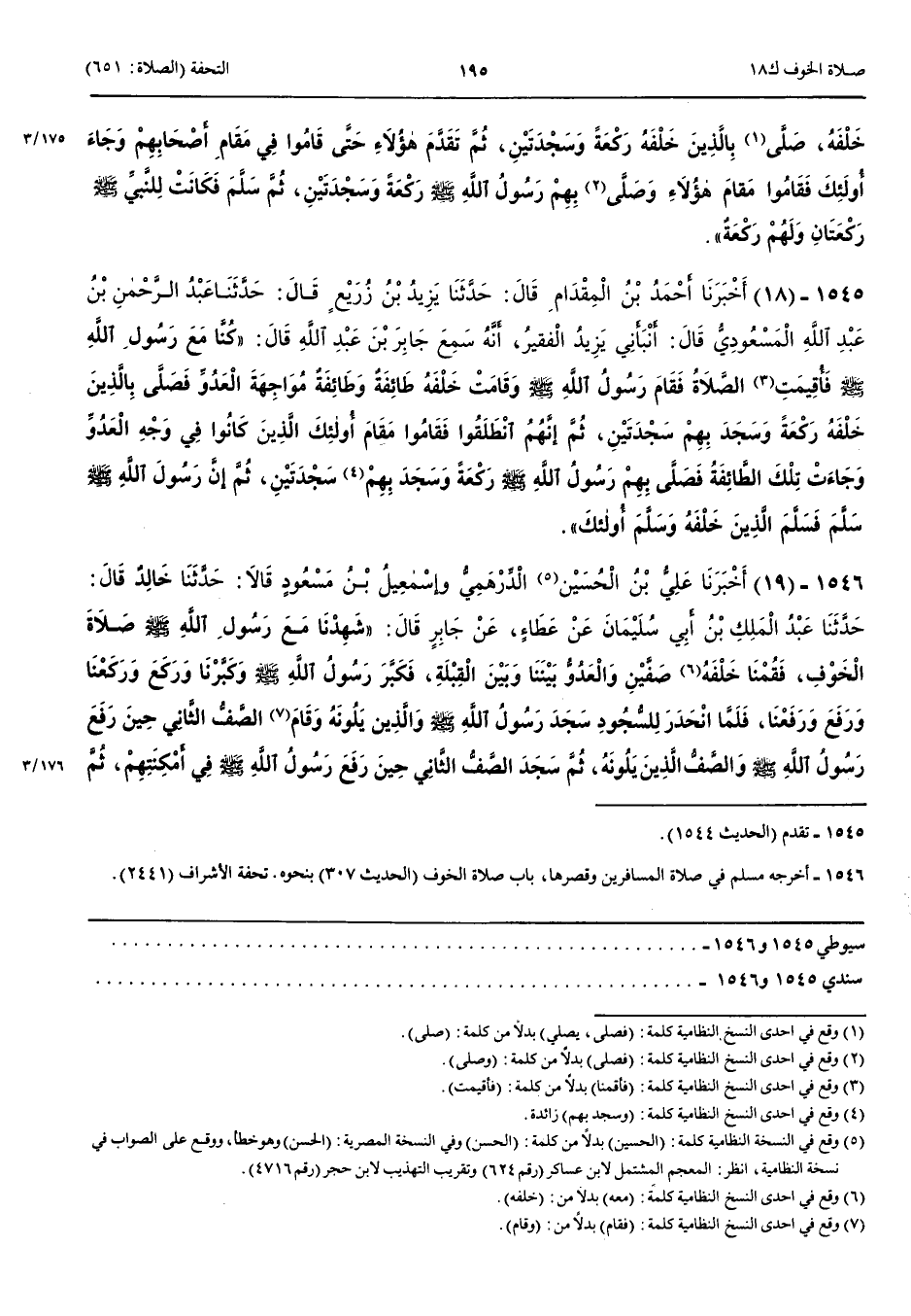 1545 - أَخْبَرَنَا أَحْمَدُ بْنُ الْمِقْدَامِ قَالَ حَدَّثَنَا يَزِيدُ بْنُ زُرَيْعٍ قَالَ حَدَّثَنَا عَبْدُ الرَّحْمَنِ بْنُ عَبْدِ اللَّهِ الْمَسْعُودِيُّ قَالَ أَنْبَأَنِي يَزِيدُ الْفَقِيرُ أَنَّهُ سَمِعَ جَابِرَ بْنَ عَبْدِ اللَّهِ قَالَ كُنَّا مَعَ رَسُولِ اللَّهِ صَلَّى اللَّهُ عَلَيْهِ وَسَلَّمَ فَأُقِيمَتْ الصَّلَاةُ فَقَامَ رَسُولُ اللَّهِ صَلَّى اللَّهُ عَلَيْهِ وَسَلَّمَ وَقَامَتْ خَلْفَهُ طَائِفَةٌ وَطَائِفَةٌ مُوَاجِهَةَ الْعَدُوِّ فَصَلَّى بِالَّذِينَ خَلْفَهُ رَكْعَةً وَسَجَدَ بِهِمْ سَجْدَتَيْنِ ثُمَّ إِنَّهُمْ انْطَلَقُوا فَقَامُوا مَقَامَ أُولَئِكَ الَّذِينَ كَانُوا فِي وَجْهِ الْعَدُوِّ وَجَاءَتْ تِلْكَ الطَّائِفَةُ فَصَلَّى بِهِمْ رَسُولُ اللَّهِ صَلَّى اللَّهُ عَلَيْهِ وَسَلَّمَ رَكْعَةً وَسَجَدَ بِهِمْ سَجْدَتَيْنِ ثُمَّ إِنَّ رَسُولَ اللَّهِ صَلَّى اللَّهُ عَلَيْهِ وَسَلَّمَ سَلَّمَ فَسَلَّمَ الَّذِينَ خَلْفَهُ وَسَلَّمَ أُولَئِكَ