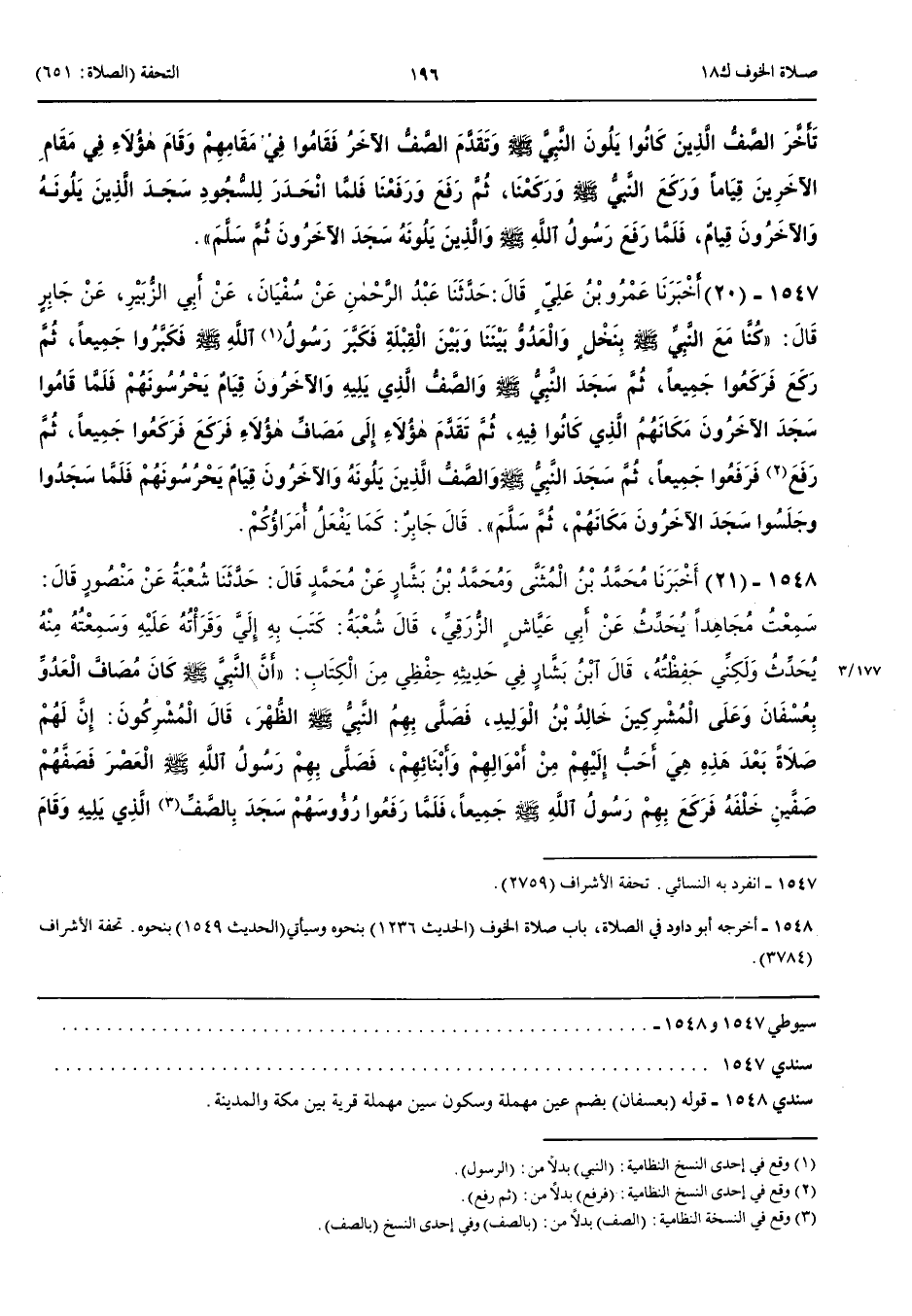 1547 - أَخْبَرَنَا عَمْرُو بْنُ عَلِيٍّ قَالَ حَدَّثَنَا عَبْدُ الرَّحْمَنِ عَنْ سُفْيَانَ عَنْ أَبِي الزُّبَيْرِ عَنْ جَابِرٍ قَالَ كُنَّا مَعَ النَّبِيِّ صَلَّى اللَّهُ عَلَيْهِ وَسَلَّمَ بِنَخْلٍ وَالْعَدُوُّ بَيْنَنَا وَبَيْنَ الْقِبْلَةِ فَكَبَّرَ رَسُولُ اللَّهِ صَلَّى اللَّهُ عَلَيْهِ وَسَلَّمَ فَكَبَّرُوا جَمِيعًا ثُمَّ رَكَعَ فَرَكَعُوا جَمِيعًا ثُمَّ سَجَدَ النَّبِيُّ صَلَّى اللَّهُ عَلَيْهِ وَسَلَّمَ وَالصَّفُّ الَّذِي يَلِيهِ وَالْآخَرُونَ قِيَامٌ يَحْرُسُونَهُمْ فَلَمَّا قَامُوا سَجَدَ الْآخَرُونَ مَكَانَهُمْ الَّذِي كَانُوا فِيهِ ثُمَّ تَقَدَّمَ هَؤُلَاءِ إِلَى مَصَافِّ هَؤُلَاءِ فَرَكَعَ فَرَكَعُوا جَمِيعًا ثُمَّ رَفَعَ فَرَفَعُوا جَمِيعًا ثُمَّ سَجَدَ النَّبِيُّ صَلَّى اللَّهُ عَلَيْهِ وَسَلَّمَ وَالصَّفُّ الَّذِينَ يَلُونَهُ وَالْآخَرُونَ قِيَامٌ يَحْرُسُونَهُمْ فَلَمَّا سَجَدُوا وَجَلَسُوا سَجَدَ الْآخَرُونَ مَكَانَهُمْ ثُمَّ سَلَّمَ قَالَ جَابِرٌ كَمَا يَفْعَلُ أُمَرَاؤُكُمْ