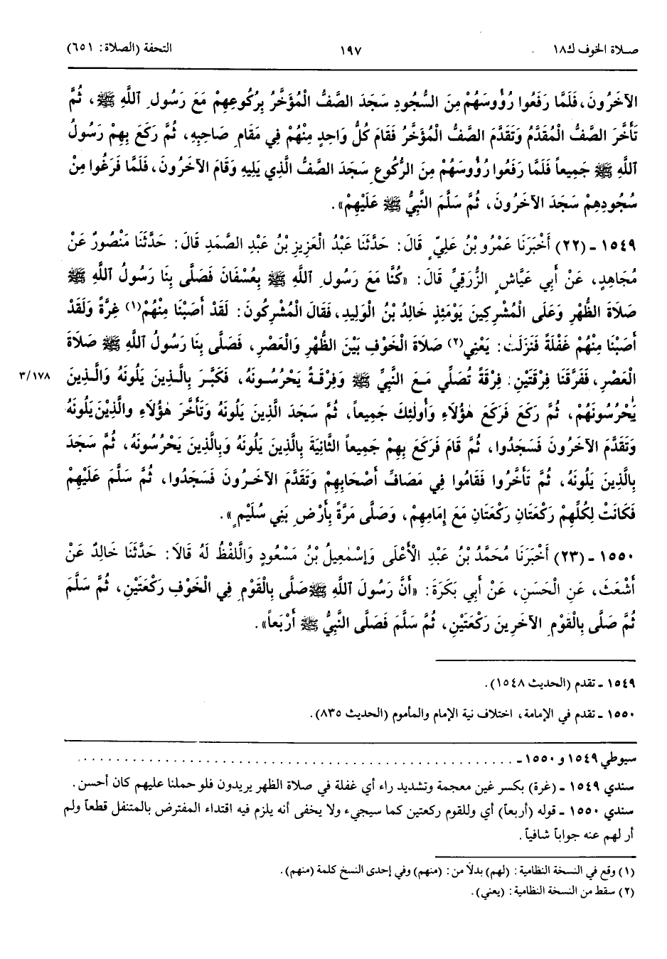 1550 - أَخْبَرَنَا مُحَمَّدُ بْنُ عَبْدِ الْأَعْلَى وَإِسْمَعِيلُ بْنُ مَسْعُودٍ وَاللَّفْظُ لَهُ قَالَا حَدَّثَنَا خَالِدٌ عَنْ أَشْعَثَ عَنْ الْحَسَنِ عَنْ أَبِي بَكْرَةَ أَنَّ رَسُولَ اللَّهِ صَلَّى اللَّهُ عَلَيْهِ وَسَلَّمَ صَلَّى بِالْقَوْمِ فِي الْخَوْفِ رَكْعَتَيْنِ ثُمَّ سَلَّمَ ثُمَّ صَلَّى بِالْقَوْمِ الْآخَرِينَ رَكْعَتَيْنِ ثُمَّ سَلَّمَ فَصَلَّى النَّبِيُّ صَلَّى اللَّهُ عَلَيْهِ وَسَلَّمَ أَرْبَعًا