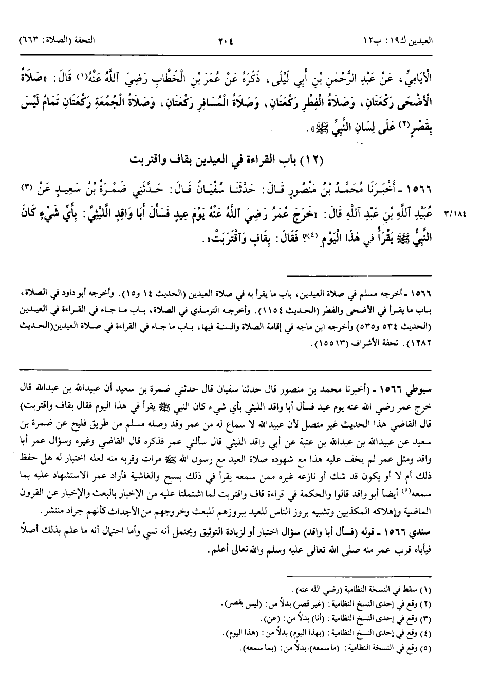 بَاب الْقِرَاءَةِ فِي الْعِيدَيْنِ بِقَافْ وَاقْتَرَبَتْ 1566 - أَخْبَرَنَا مُحَمَّدُ بْنُ مَنْصُورٍ قَالَ أَنْبَأَنَا سُفْيَانُ قَالَ حَدَّثَنِي ضَمْرَةُ بْنُ سَعِيدٍ عَنْ عُبَيْدِ اللَّهِ بْنِ عَبْدِ اللَّهِ قَالَ خَرَجَ عُمَرُ رَضِيَ اللَّهُ عَنْهُ يَوْمَ عِيدٍ فَسَأَلَ أَبَا وَاقِدٍ اللَّيْثِيَّ بِأَيِّ شَيْءٍ كَانَ النَّبِيُّ صَلَّى اللَّهُ عَلَيْهِ وَسَلَّمَ يَقْرَأُ فِي هَذَا الْيَوْمِ فَقَالَ بِقَافْ وَاقْتَرَبَتْ