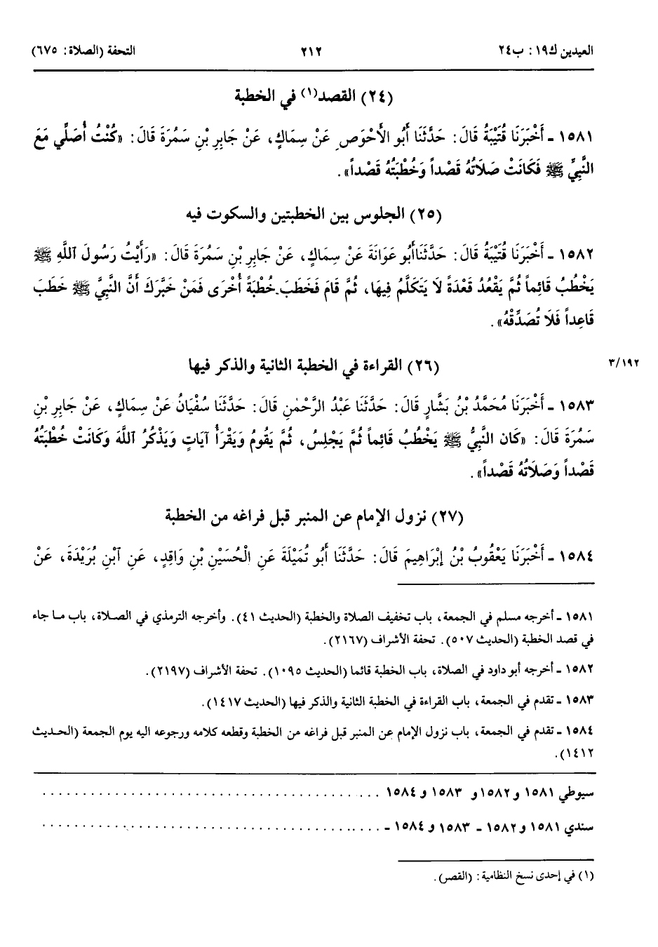 الْقَصْدُ فِي الْخُطْبَةِ 1581 - أَخْبَرَنَا قُتَيْبَةُ قَالَ حَدَّثَنَا أَبُو الْأَحْوَصِ عَنْ سِمَاكٍ عَنْ جَابِرِ بْنِ سَمُرَةَ قَالَ كُنْتُ أُصَلِّي مَعَ النَّبِيِّ صَلَّى اللَّهُ عَلَيْهِ وَسَلَّمَ فَكَانَتْ صَلَاتُهُ قَصْدًا وَخُطْبَتُهُ قَصْدًا