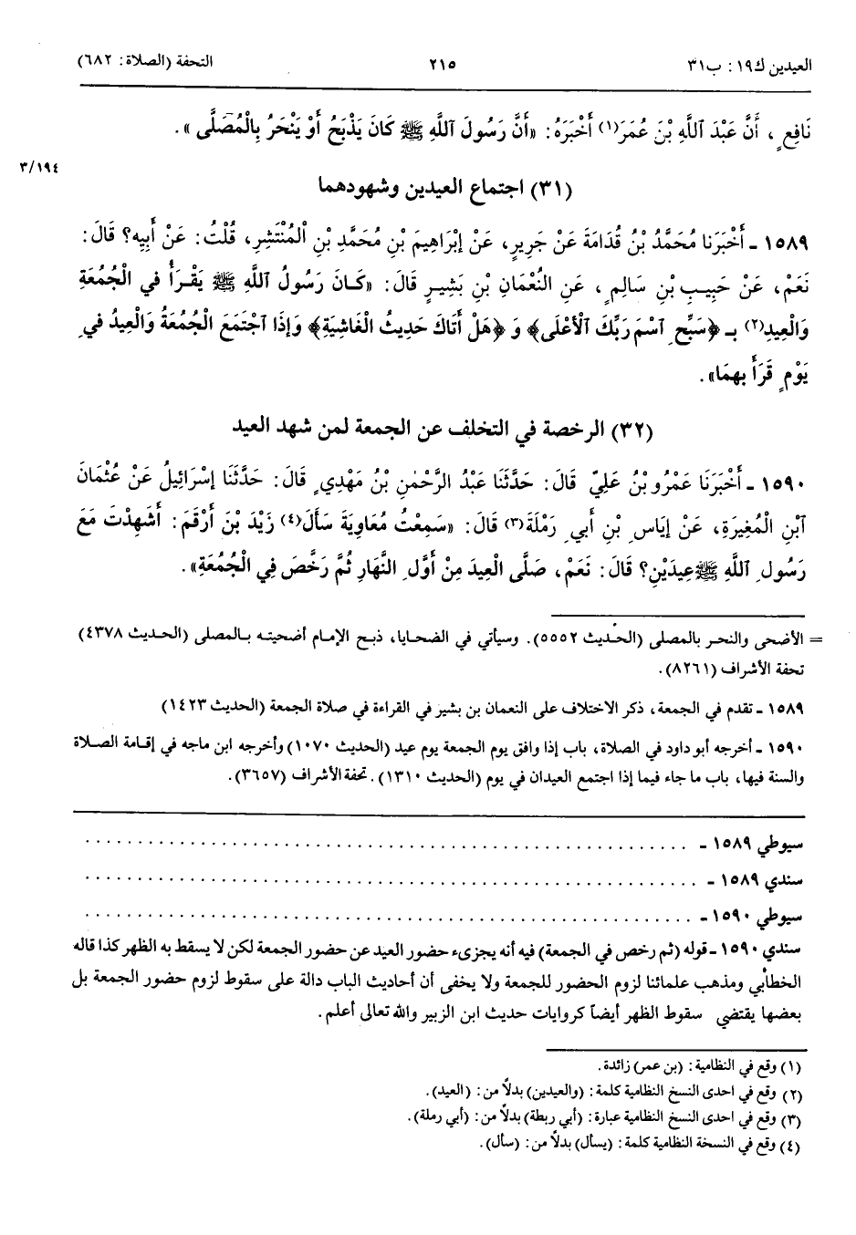 اجْتِمَاعُ الْعِيدَيْنِ وَشُهُودُهُمَا 1589 - أَخْبَرَنِي مُحَمَّدُ بْنُ قُدَامَةَ عَنْ جَرِيرٍ عَنْ إِبْرَاهِيمَ بْنِ مُحَمَّدِ بْنِ الْمُنْتَشِرِ قُلْتُ عَنْ أَبِيهِ قَالَ نَعَمْ عَنْ حَبِيبِ بْنِ سَالِمٍ عَنْ النُّعْمَانِ بْنِ بَشِيرٍ قَالَ كَانَ رَسُولُ اللَّهِ صَلَّى اللَّهُ عَلَيْهِ وَسَلَّمَ يَقْرَأُ فِي الْجُمُعَةِ وَالْعِيدِ بِسَبِّحْ اسْمَ رَبِّكَ الْأَعْلَى وَهَلْ أَتَاكَ حَدِيثُ الْغَاشِيَةِ وَإِذَا اجْتَمَعَ الْجُمُعَةُ وَالْعِيدُ فِي يَوْمٍ قَرَأَ بِهِمَا