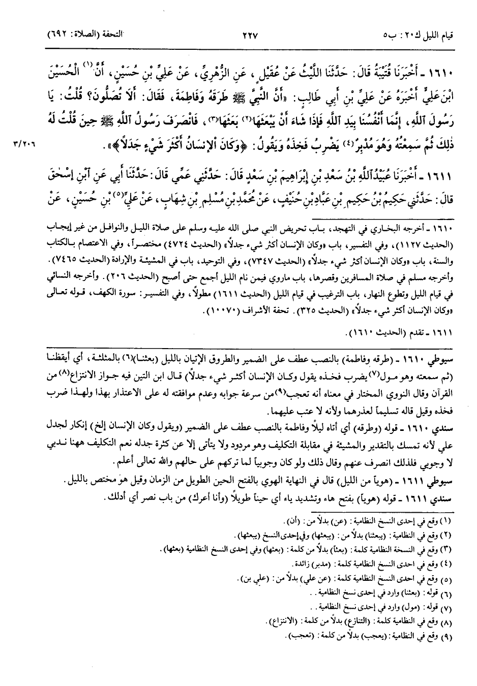 1611 - أَخْبَرَنَا عُبَيْدُ اللَّهِ بْنُ سَعْدِ بْنِ إِبْرَاهِيمَ بْنِ سَعْدٍ قَالَ حَدَّثَنَا عَمِّي قَالَ حَدَّثَنَا أَبِي عَنْ ابْنِ إِسْحَقَ قَالَ حَدَّثَنِي حَكِيمُ بْنُ حَكِيمِ بْنِ عَبَّادِ بْنِ حُنَيْفٍ عَنْ مُحَمَّدِ بْنِ مُسْلِمِ بْنِ شِهَابٍ عَنْ عَلِيِّ بْنِ حُسَيْنٍ عَنْ أَبِيهِ عَنْ جَدِّهِ عَلِيِّ بْنِ أَبِي طَالِبٍ قَالَ دَخَلَ عَلَيَّ رَسُولُ اللَّهِ صَلَّى اللَّهُ عَلَيْهِ وَسَلَّمَ وَعَلَى فَاطِمَةَ مِنْ اللَّيْلِ فَأَيْقَظَنَا لِلصَّلَاةِ ثُمَّ رَجَعَ إِلَى بَيْتِهِ فَصَلَّى هَوِيًّا مِنْ اللَّيْلِ فَلَمْ يَسْمَعْ لَنَا حِسًّا فَرَجَعَ إِلَيْنَا فَأَيْقَظَنَا فَقَالَ قُومَا فَصَلِّيَا قَالَ فَجَلَسْتُ وَأَنَا أَعْرُكُ عَيْنِي وَأَقُولُ إِنَّا وَاللَّهِ مَا نُصَلِّي إِلَّا مَا كَتَبَ اللَّهُ لَنَا إِنَّمَا أَنْفُسُنَا بِيَدِ اللَّهِ فَإِنْ شَاءَ أَنْ يَبْعَثَنَا بَعَثَنَا قَالَ فَوَلَّى رَسُولُ اللَّهِ صَلَّى اللَّهُ عَلَيْهِ وَسَلَّمَ وَهُوَ يَقُولُ وَيَضْرِبُ بِيَدِهِ عَلَى فَخِذِهِ مَا نُصَلِّي إِلَّا مَا كَتَبَ اللَّهُ لَنَا { وَكَانَ الْإِنْسَانُ أَكْثَرَ شَيْءٍ جَدَلًا }