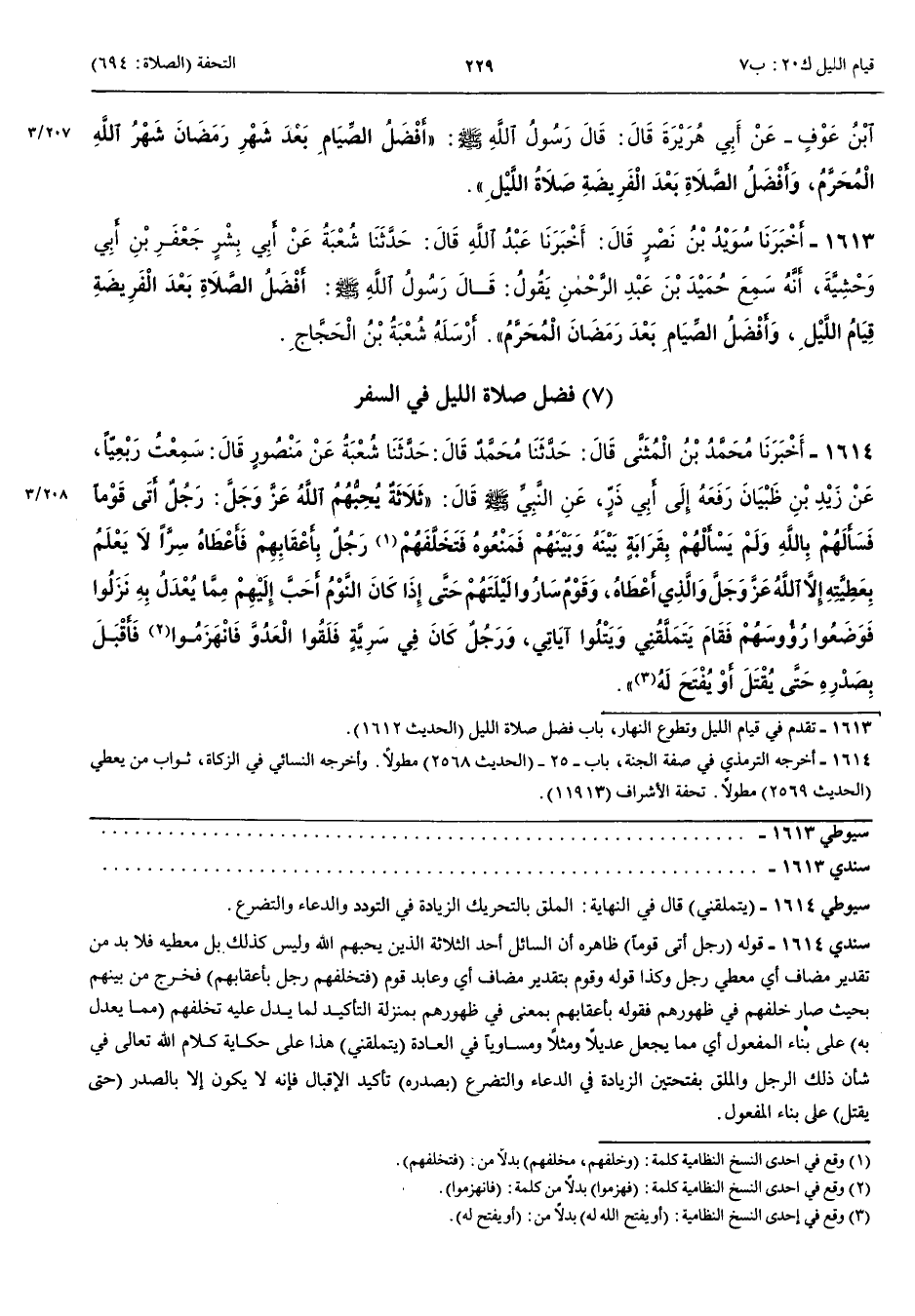 فَضْلُ صَلَاةِ اللَّيْلِ فِي السَّفَرِ 1614 - أَخْبَرَنَا مُحَمَّدُ بْنُ الْمُثَنَّى قَالَ حَدَّثَنَا مُحَمَّدٌ قَالَ حَدَّثَنَا شُعْبَةُ عَنْ مَنْصُورٍ قَالَ سَمِعْتُ رِبْعِيًّا عَنْ زَيْدِ بْنِ ظَبْيَانَ رَفَعَهُ إِلَى أَبِي ذَرٍّ عَنْ النَّبِيِّ صَلَّى اللَّهُ عَلَيْهِ وَسَلَّمَ قَالَ ثَلَاثَةٌ يُحِبُّهُمْ اللَّهُ عَزَّ وَجَلَّ رَجُلٌ أَتَى قَوْمًا فَسَأَلَهُمْ بِاللَّهِ وَلَمْ يَسْأَلْهُمْ بِقَرَابَةٍ بَيْنَهُ وَبَيْنَهُمْ فَمَنَعُوهُ فَتَخَلَّفَهُمْ رَجُلٌ بِأَعْقَابِهِمْ فَأَعْطَاهُ سِرًّا لَا يَعْلَمُ بِعَطِيَّتِهِ إِلَّا اللَّهُ عَزَّ وَجَلَّ وَالَّذِي أَعْطَاهُ وَقَوْمٌ سَارُوا لَيْلَتَهُمْ حَتَّى إِذَا كَانَ النَّوْمُ أَحَبَّ إِلَيْهِمْ مِمَّا يُعْدَلُ بِهِ نَزَلُوا فَوَضَعُوا رُءُوسَهُمْ فَقَامَ يَتَمَلَّقُنِي وَيَتْلُو آيَاتِي وَرَجُلٌ كَانَ فِي سَرِيَّةٍ فَلَقُوا الْعَدُوَّ فَانْهَزَمُوا فَأَقْبَلَ بِصَدْرِهِ حَتَّى يُقْتَلَ أَوْ يُفْتَحَ لَهُ