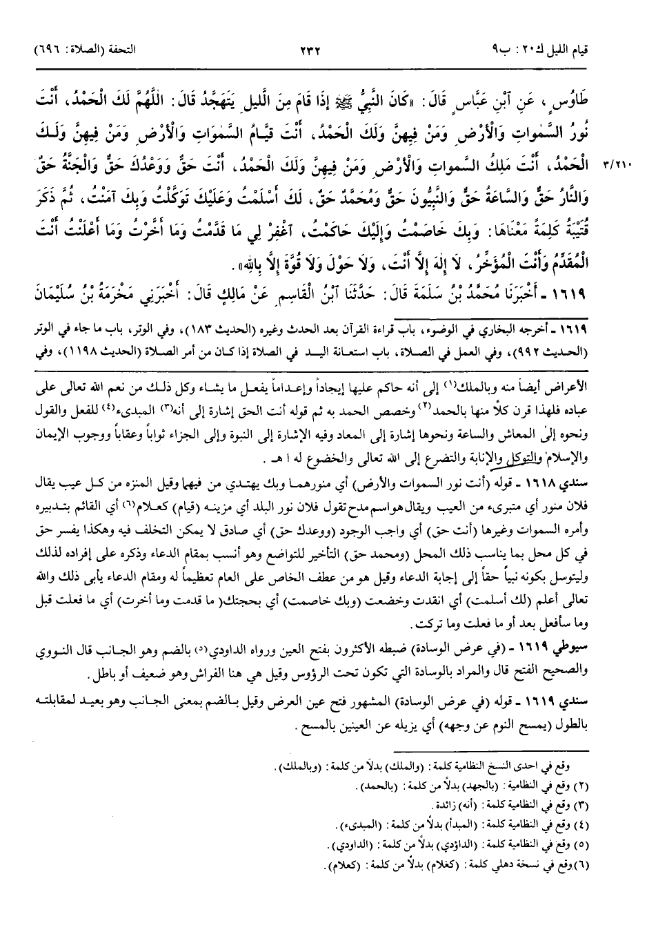 1619 - أَخْبَرَنَا مُحَمَّدُ بْنُ سَلَمَةَ قَالَ أَنْبَأَنَا ابْنُ الْقَاسِمِ عَنْ مَالِكٍ قَالَ حَدَّثَنِي مَخْرَمَةُ بْنُ سُلَيْمَانَ عَنْ كُرَيْبٍ أَنَّ عَبْدَ اللَّهِ بْنَ عَبَّاسٍ أَخْبَرَهُ أَنَّهُ بَاتَ عِنْدَ مَيْمُونَةَ أُمِّ الْمُؤْمِنِينَ وَهِيَ خَالَتُهُ فَاضْطَجَعَ فِي عَرْضِ الْوِسَادَةِ وَاضْطَجَعَ رَسُولُ اللَّهِ صَلَّى اللَّهُ عَلَيْهِ وَسَلَّمَ وَأَهْلُهُ فِي طُولِهَا فَنَامَ رَسُولُ اللَّهِ صَلَّى اللَّهُ عَلَيْهِ وَسَلَّمَ حَتَّى إِذَا انْتَصَفَ اللَّيْلُ أَوْ قَبْلَهُ قَلِيلًا أَوْ بَعْدَهُ قَلِيلًا اسْتَيْقَظَ رَسُولُ اللَّهِ صَلَّى اللَّهُ عَلَيْهِ وَسَلَّمَ فَجَلَسَ يَمْسَحُ النَّوْمَ عَنْ وَجْهِهِ بِيَدِهِ ثُمَّ قَرَأَ الْعَشْرَ الْآيَاتِ الْخَوَاتِيمَ مِنْ سُورَةِ آلِ عِمْرَانَ ثُمَّ قَامَ إِلَى شَنٍّ مُعَلَّقَةٍ فَتَوَضَّأَ مِنْهَا فَأَحْسَنَ وُضُوءَهُ ثُمَّ قَامَ يُصَلِّي قَالَ عَبْدُ اللَّهِ بْنُ عَبَّاسٍ فَقُمْتُ فَصَنَعْتُ مِثْلَ مَا صَنَعَ ثُمَّ ذَهَبْتُ فَقُمْتُ إِلَى جَنْبِهِ فَوَضَعَ رَسُولُ اللَّهِ صَلَّى اللَّهُ عَلَيْهِ وَسَلَّمَ يَدَهُ الْيُمْنَى عَلَى رَأْسِي وَأَخَذَ بِأُذُنِي الْيُمْنَى يَفْتِلُهَا فَصَلَّى رَكْعَتَيْنِ ثُمَّ رَكْعَتَيْنِ ثُمَّ رَكْعَتَيْنِ ثُمَّ رَكْعَتَيْنِ ثُمَّ رَكْعَتَيْنِ ثُمَّ رَكْعَتَيْنِ ثُمَّ أَوْتَرَ ثُمَّ اضْطَجَعَ حَتَّى جَاءَهُ الْمُؤَذِّنُ فَصَلَّى رَكْعَتَيْنِ خَفِيفَتَيْنِ