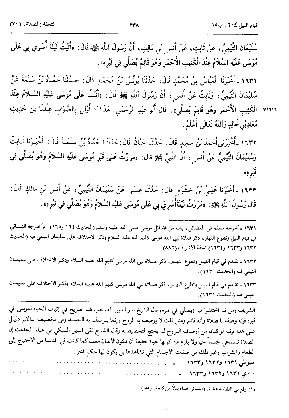 1633 - أَخْبَرَنَا عَلِيُّ بْنُ خَشْرَمٍ قَالَ حَدَّثَنَا عِيسَى عَنْ سُلَيْمَانَ التَّيْمِيِّ عَنْ أَنَسِ بْنِ مَالِكٍ قَالَ قَالَ رَسُولُ اللَّهِ صَلَّى اللَّهُ عَلَيْهِ وَسَلَّمَ مَرَرْتُ لَيْلَةَ أُسْرِيَ بِي عَلَى مُوسَى عَلَيْهِ السَّلَام وَهُوَ يُصَلِّي فِي قَبْرِهِ