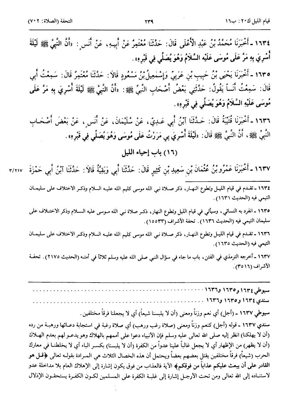 1636 - أَخْبَرَنَا قُتَيْبَةُ قَالَ حَدَّثَنَا ابْنُ أَبِي عَدِيٍّ عَنْ سُلَيْمَانَ عَنْ أَنَسٍ عَنْ بَعْضِ أَصْحَابِ النَّبِيِّ صَلَّى اللَّهُ عَلَيْهِ وَسَلَّمَ أَنَّ النَّبِيَّ صَلَّى اللَّهُ عَلَيْهِ وَسَلَّمَ قَالَ لَيْلَةَ أُسْرِيَ بِي مَرَرْتُ عَلَى مُوسَى وَهُوَ يُصَلِّي فِي قَبْرِهِ