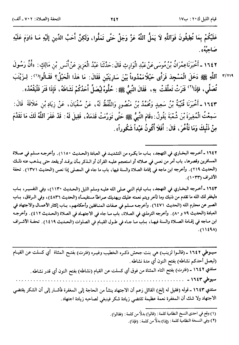 1643 - أَخْبَرَنَا قُتَيْبَةُ بْنُ سَعِيدٍ وَمُحَمَّدُ بْنُ مَنْصُورٍ وَاللَّفْظُ لَهُ عَنْ سُفْيَانَ عَنْ زِيَادِ بْنِ عِلَاقَةَ قَالَ سَمِعْتُ الْمُغِيرَةَ بْنَ شُعْبَةَ يَقُولُ قَامَ النَّبِيُّ صَلَّى اللَّهُ عَلَيْهِ وَسَلَّمَ حَتَّى تَوَرَّمَتْ قَدَمَاهُ فَقِيلَ لَهُ قَدْ غَفَرَ اللَّهُ لَكَ مَا تَقَدَّمَ مِنْ ذَنْبِكَ وَمَا تَأَخَّرَ قَالَ أَفَلَا أَكُونُ عَبْدًا شَكُورًا