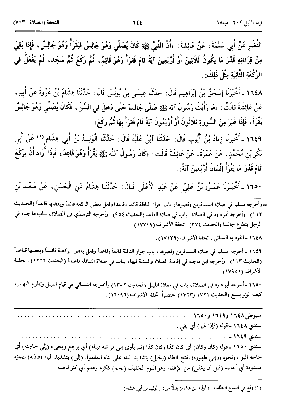 1650 - أَخْبَرَنَا عَمْرُو بْنُ عَلِيٍّ عَنْ عَبْدِ الْأَعْلَى قَالَ حَدَّثَنَا هِشَامٌ عَنْ الْحَسَنِ عَنْ سَعْدِ بْنِ هِشَامِ بْنِ عَامِرٍ قَالَ قَدِمْتُ الْمَدِينَةَ فَدَخَلْتُ عَلَى عَائِشَةَ رَضِيَ اللَّهُ عَنْهَا قَالَتْ مَنْ أَنْتَ قُلْتُ أَنَا سَعْدُ بْنُ هِشَامِ بْنِ عَامِرٍ قَالَتْ رَحِمَ اللَّهُ أَبَاكَ قُلْتُ أَخْبِرِينِي عَنْ صَلَاةِ رَسُولِ اللَّهِ صَلَّى اللَّهُ عَلَيْهِ وَسَلَّمَ قَالَتْ إِنَّ رَسُولَ اللَّهِ صَلَّى اللَّهُ عَلَيْهِ وَسَلَّمَ كَانَ وَكَانَ قُلْتُ أَجَلْ قَالَتْ إِنَّ رَسُولَ اللَّهِ صَلَّى اللَّهُ عَلَيْهِ وَسَلَّمَ كَانَ يُصَلِّي بِاللَّيْلِ صَلَاةَ الْعِشَاءِ ثُمَّ يَأْوِي إِلَى فِرَاشِهِ فَيَنَامُ فَإِذَا كَانَ جَوْفُ اللَّيْلِ قَامَ إِلَى حَاجَتِهِ وَإِلَى طَهُورِهِ فَتَوَضَّأَ ثُمَّ دَخَلَ الْمَسْجِدَ فَيُصَلِّي ثَمَانِيَ رَكَعَاتٍ يُخَيَّلُ إِلَيَّ أَنَّهُ يُسَوِّي بَيْنَهُنَّ فِي الْقِرَاءَةِ وَالرُّكُوعِ وَالسُّجُودِ وَيُوتِرُ بِرَكْعَةٍ ثُمَّ يُصَلِّي رَكْعَتَيْنِ وَهُوَ جَالِسٌ ثُمَّ يَضَعُ جَنْبَهُ فَرُبَّمَا جَاءَ بِلَالٌ فَآذَنَهُ بِالصَّلَاةِ قَبْلَ أَنْ يُغْفِيَ وَرُبَّمَا يُغْفِي وَرُبَّمَا شَكَكْتُ أَغْفَى أَوْ لَمْ يُغْفِ حَتَّى يُؤْذِنَهُ بِالصَّلَاةِ فَكَانَتْ تِلْكَ صَلَاةُ رَسُولِ اللَّهِ صَلَّى اللَّهُ عَلَيْهِ وَسَلَّمَ حَتَّى أَسَنَّ وَلُحِمَ فَذَكَرَتْ مِنْ لَحْمِهِ مَا شَاءَ اللَّهُ قَالَتْ وَكَانَ النَّبِيُّ صَلَّى اللَّهُ عَلَيْهِ وَسَلَّمَ يُصَلِّي بِالنَّاسِ الْعِشَاءَ ثُمَّ يَأْوِي إِلَى فِرَاشِهِ فَإِذَا كَانَ جَوْفُ اللَّيْلِ قَامَ إِلَى طَهُورِهِ وَإِلَى حَاجَتِهِ فَتَوَضَّأَ ثُمَّ يَدْخُلُ الْمَسْجِدَ فَيُصَلِّي سِتَّ رَكَعَاتٍ يُخَيَّلُ إِلَيَّ أَنَّهُ يُسَوِّي بَيْنَهُنَّ فِي الْقِرَاءَةِ وَالرُّكُوعِ وَالسُّجُودِ ثُمَّ يُوتِرُ بِرَكْعَةٍ ثُمَّ يُصَلِّي رَكْعَتَيْنِ وَهُوَ جَالِسٌ ثُمَّ يَضَعُ جَنْبَهُ وَرُبَّمَا جَاءَ بِلَالٌ فَآذَنَهُ بِالصَّلَاةِ قَبْلَ أَنْ يُغْفِيَ وَرُبَّمَا أَغْفَى وَرُبَّمَا شَكَكْتُ أَغْفَى أَمْ لَا حَتَّى يُؤْذِنَهُ بِالصَّلَاةِ قَالَتْ فَمَا زَالَتْ تِلْكَ صَلَاةُ رَسُولِ اللَّهِ صَلَّى اللَّهُ عَلَيْهِ وَسَلَّمَ