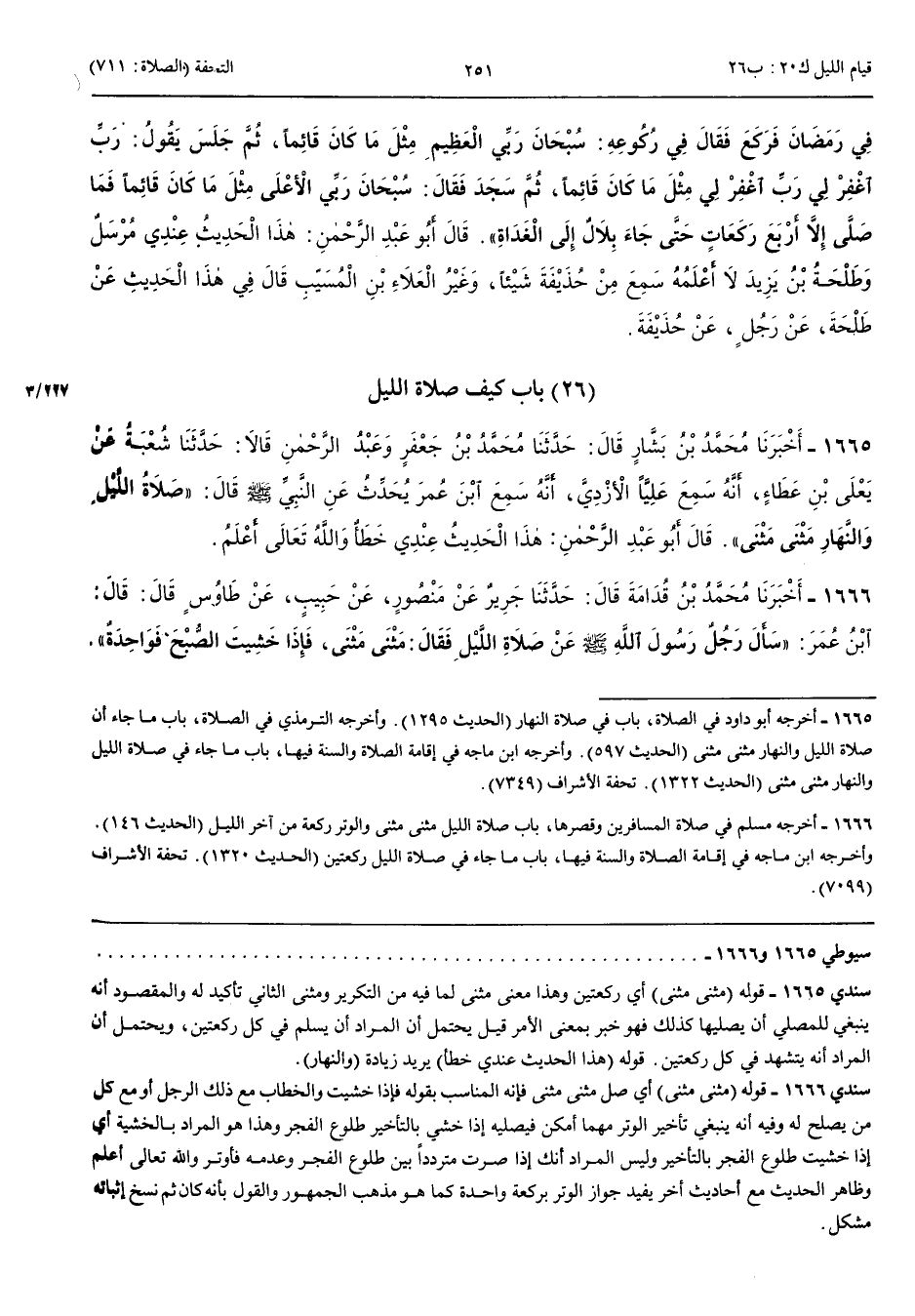 بَاب كَيْفَ صَلَاةُ اللَّيْلِ 1665 - أَخْبَرَنَا مُحَمَّدُ بْنُ بَشَّارٍ قَالَ حَدَّثَنَا مُحَمَّدُ بْنُ جَعْفَرٍ وَعَبْدُ الرَّحْمَنِ قَالَا حَدَّثَنَا شُعْبَةُ عَنْ يَعْلَى بْنِ عَطَاءٍ أَنَّهُ سَمِعَ عَلِيًّا الْأَزْدِيَّ أَنَّهُ سَمِعَ ابْنَ عُمَرَ يُحَدِّثُ عَنْ النَّبِيِّ صَلَّى اللَّهُ عَلَيْهِ وَسَلَّمَ قَالَ صَلَاةُ اللَّيْلِ وَالنَّهَارِ مَثْنَى مَثْنَى أَبُو عَبْد الرَّحْمَنِ هَذَا الْحَدِيثُ عِنْدِي خَطَأٌ وَاللَّهُ تَعَالَى أَعْلَمُ