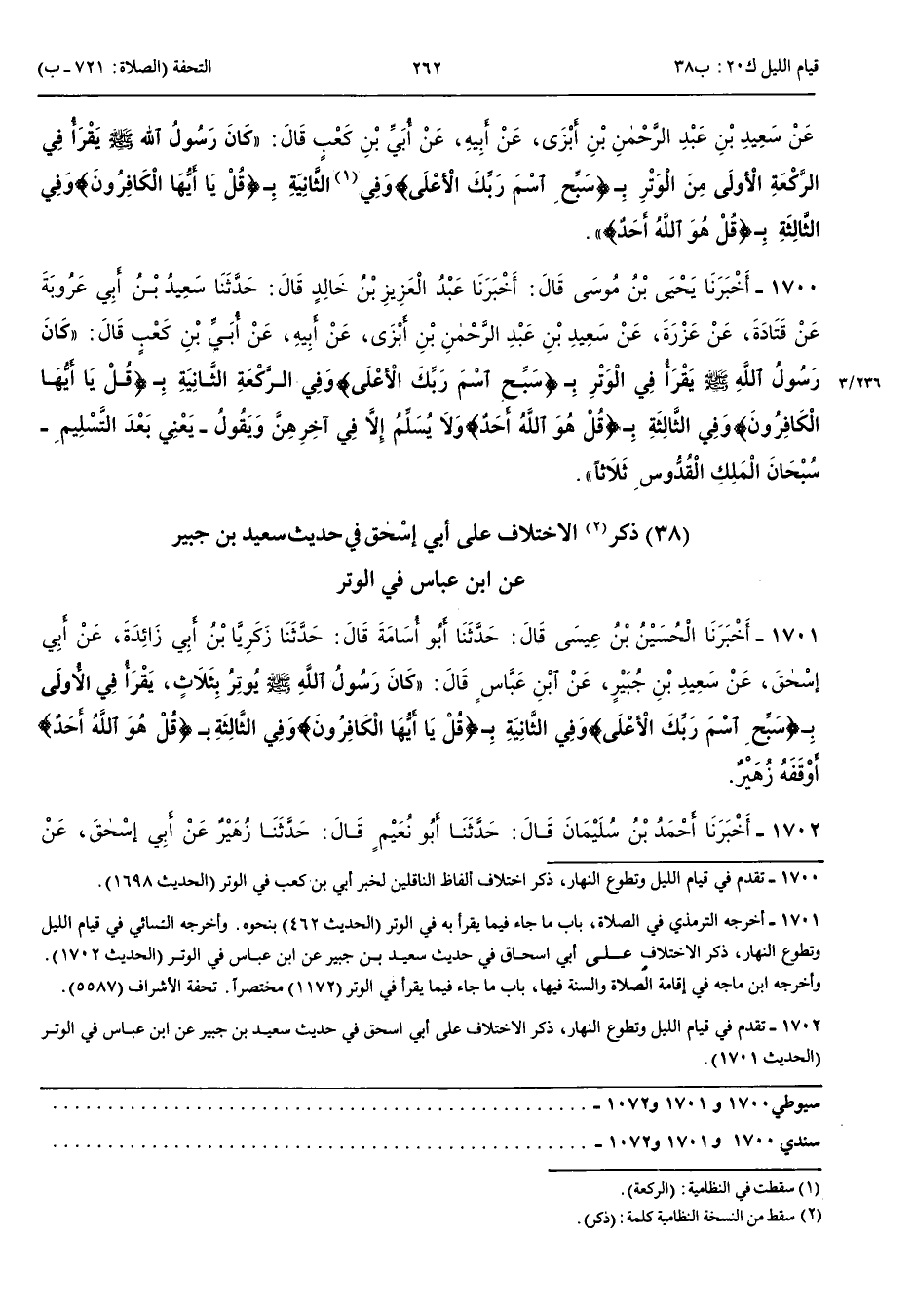 1702 - أَخْبَرَنَا أَحْمَدُ بْنُ سُلَيْمَانَ قَالَ حَدَّثَنَا أَبُو نُعَيْمٍ قَالَ حَدَّثَنَا زُهَيْرٌ عَنْ أَبِي إِسْحَقَ عَنْ سَعِيدِ بْنِ جُبَيْرٍ عَنْ ابْنِ عَبَّاسٍ أَنَّهُ كَانَ يُوتِرُ بِثَلَاثٍ بِسَبِّحْ اسْمَ رَبِّكَ الْأَعْلَى وَقُلْ يَا أَيُّهَا الْكَافِرُونَ وَقُلْ هُوَ اللَّهُ أَحَدٌ