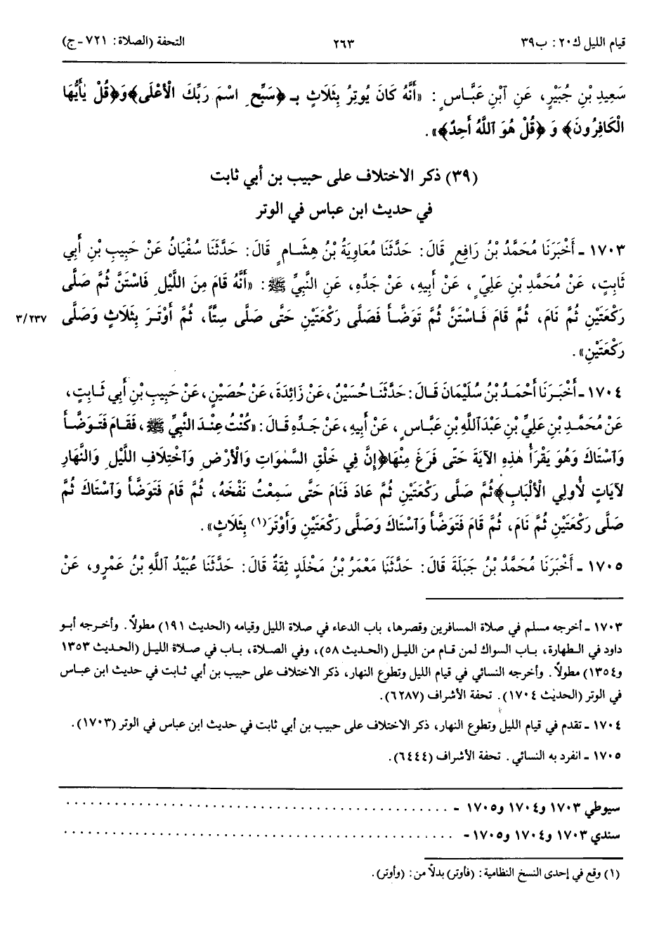 ذِكْرُ الِاخْتِلَافِ عَلَى حَبِيبِ بْنِ أَبِي ثَابِتٍ فِي حَدِيثِ ابْنِ عَبَّاسٍ فِي الْوِتْرِ 1703 - أَخْبَرَنَا مُحَمَّدُ بْنُ رَافِعٍ قَالَ حَدَّثَنَا مُعَاوِيَةُ بْنُ هِشَامٍ قَالَ حَدَّثَنَا سُفْيَانُ عَنْ حَبِيبِ بْنِ أَبِي ثَابِتٍ عَنْ مُحَمَّدِ بْنِ عَلِيٍّ عَنْ أَبِيهِ عَنْ جَدِّهِ عَنْ النَّبِيِّ صَلَّى اللَّهُ عَلَيْهِ وَسَلَّمَ أَنَّهُ قَامَ مِنْ اللَّيْلِ فَاسْتَنَّ ثُمَّ صَلَّى رَكْعَتَيْنِ ثُمَّ نَامَ ثُمَّ قَامَ فَاسْتَنَّ ثُمَّ تَوَضَّأَ فَصَلَّى رَكْعَتَيْنِ حَتَّى صَلَّى سِتًّا ثُمَّ أَوْتَرَ بِثَلَاثٍ وَصَلَّى رَكْعَتَيْنِ