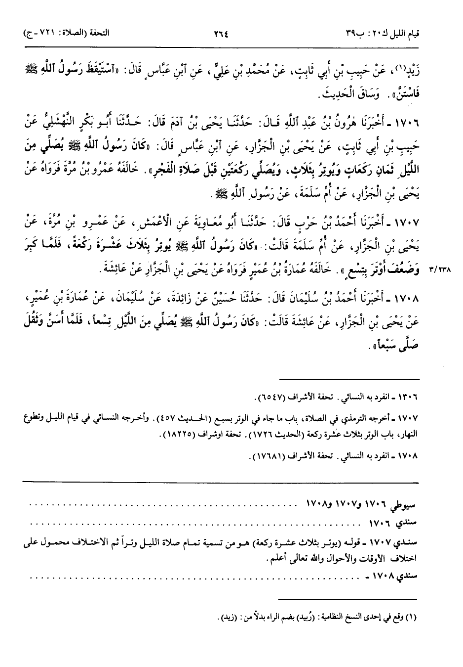 1708 - أَخْبَرَنَا أَحْمَدُ بْنُ سُلَيْمَانَ قَالَ حَدَّثَنَا حُسَيْنٌ عَنْ زَائِدَةَ عَنْ سُلَيْمَانَ عَنْ عُمَارَةَ بْنِ عُمَيْرٍ عَنْ يَحْيَى بْنِ الْجَزَّارِ عَنْ عَائِشَةَ قَالَتْ كَانَ رَسُولُ اللَّهِ صَلَّى اللَّهُ عَلَيْهِ وَسَلَّمَ يُصَلِّي مِنْ اللَّيْلِ تِسْعًا فَلَمَّا أَسَنَّ وَثَقُلَ صَلَّى سَبْعًا