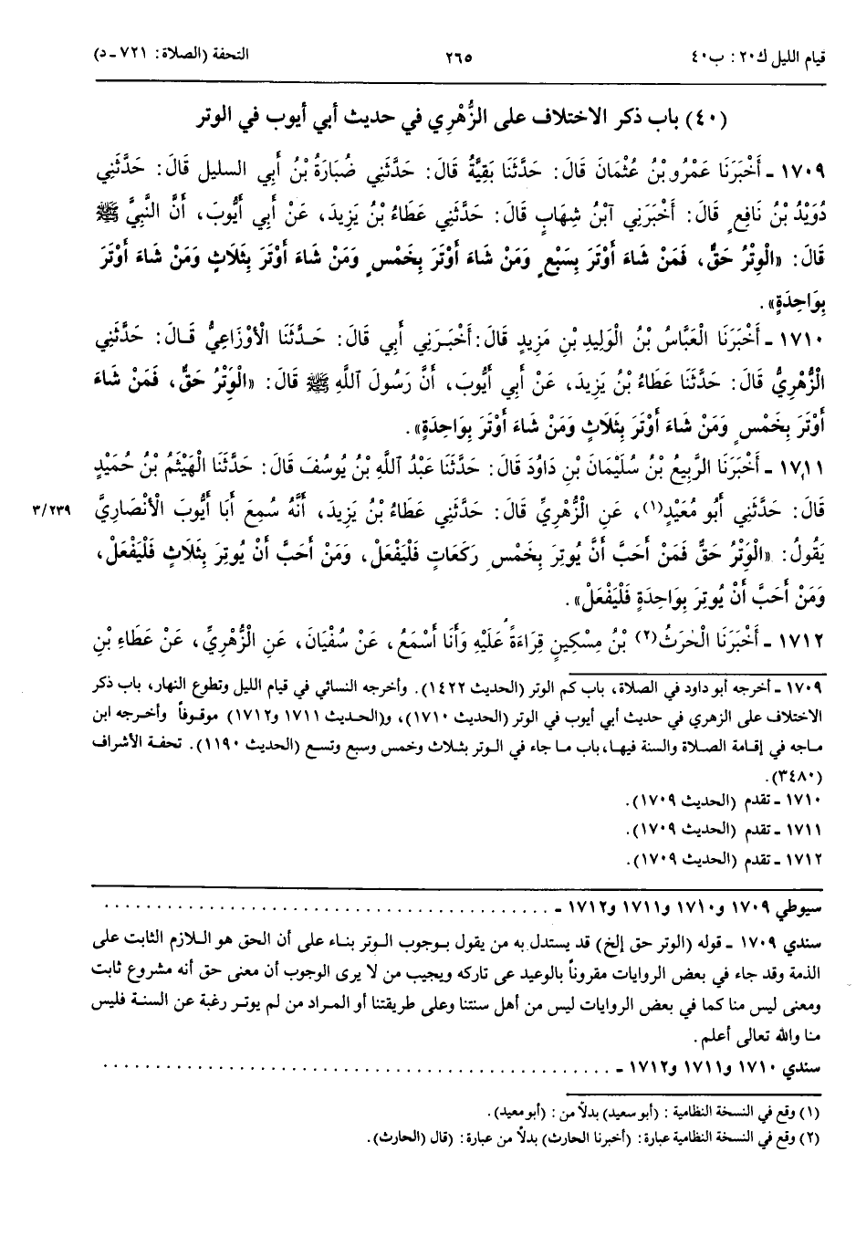 1712 - قَالَ الْحَارِثُ بْنُ مِسْكِينٍ قِرَاءَةً عَلَيْهِ وَأَنَا أَسْمَعُ عَنْ سُفْيَانَ عَنْ الزُّهْرِيِّ عَنْ عَطَاءِ بْنِ يَزِيدَ عَنْ أَبِي أَيُّوبَ قَالَ مَنْ شَاءَ أَوْتَرَ بِسَبْعٍ وَمَنْ شَاءَ أَوْتَرَ بِخَمْسٍ وَمَنْ شَاءَ أَوْتَرَ بِثَلَاثٍ وَمَنْ شَاءَ أَوْتَرَ بِوَاحِدَةٍ وَمَنْ شَاءَ أَوْمَأَ إِيمَاءً