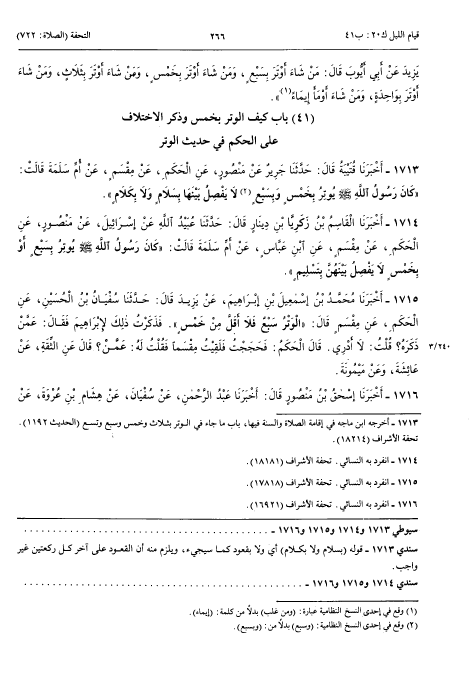 بَاب كَيْفَ الْوِتْرُ بِخَمْسٍ وَذِكْرِ الِاخْتِلَافِ عَلَى الْحَكَمِ فِي حَدِيثِ الْوِتْرِ 1713 - أَخْبَرَنَا قُتَيْبَةُ قَالَ حَدَّثَنَا جَرِيرٌ عَنْ مَنْصُورٍ عَنْ الْحَكَمِ عَنْ مِقْسَمٍ عَنْ أُمِّ سَلَمَةَ قَالَتْ كَانَ رَسُولُ اللَّهِ صَلَّى اللَّهُ عَلَيْهِ وَسَلَّمَ يُوتِرُ بِخَمْسٍ وَبِسَبْعٍ لَا يَفْصِلُ بَيْنَهَا بِسَلَامٍ وَلَا بِكَلَامٍ