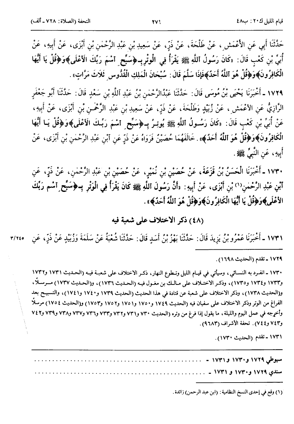 1729 - أَخْبَرَنَا يَحْيَى بْنُ مُوسَى قَالَ حَدَّثَنَا عَبْدُ الرَّحْمَنِ بْنُ عَبْدِ اللَّهِ بْنِ سَعْدٍ قَالَ حَدَّثَنَا أَبُو جَعْفَرٍ الرَّازِيُّ عَنْ الْأَعْمَشِ عَنْ زُبَيْدٍ وَطَلْحَةَ عَنْ ذَرٍّ عَنْ سَعِيدِ بْنِ عَبْدِ الرَّحْمَنِ بْنِ أَبْزَى عَنْ أَبِيهِ عَنْ أُبَيِّ بْنِ كَعْبٍ قَالَ كَانَ رَسُولُ اللَّهِ صَلَّى اللَّهُ عَلَيْهِ وَسَلَّمَ يُوتِرُ بِسَبِّحْ اسْمَ رَبِّكَ الْأَعْلَى وَقُلْ يَا أَيُّهَا الْكَافِرُونَ وَقُلْ هُوَ اللَّهُ أَحَدٌ خَالَفَهُمَا حُصَيْنٌ فَرَوَاهُ عَنْ ذَرٍّ عَنْ ابْنِ عَبْدِ الرَّحْمَنِ بْنِ أَبْزَى عَنْ أَبِيهِ عَنْ النَّبِيِّ صَلَّى اللَّهُ عَلَيْهِ وَسَلَّمَ