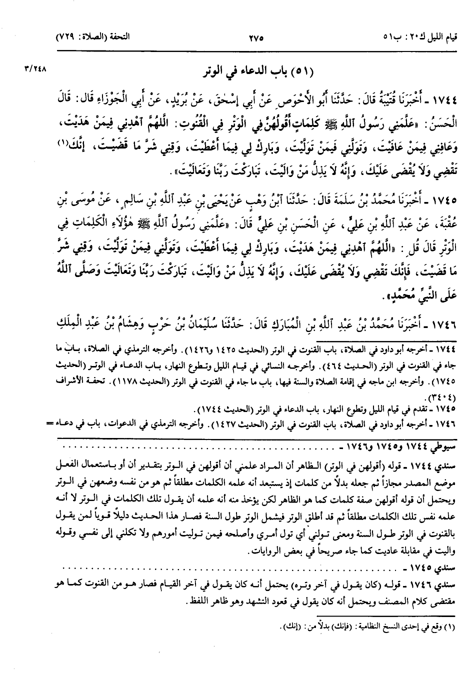 1746 - أَخْبَرَنَا مُحَمَّدُ بْنُ عَبْدِ اللَّهِ بْنِ الْمُبَارَكِ قَالَ حَدَّثَنَا سُلَيْمَانُ بْنُ حَرْبٍ وَهِشَامُ بْنُ عَبْدِ الْمَلِكِ قَالَا حَدَّثَنَا حَمَّادُ بْنُ سَلَمَةَ عَنْ هِشَامِ بْنِ عَمْرٍو الْفَزَارِيِّ عَنْ عَبْدِ الرَّحْمَنِ بْنِ الْحَارِثِ بْنِ هِشَامٍ عَنْ عَلِيِّ بْنِ أَبِي طَالِبٍ أَنَّ النَّبِيَّ صَلَّى اللَّهُ عَلَيْهِ وَسَلَّمَ كَانَ يَقُولُ فِي آخِرِ وِتْرِهِ اللَّهُمَّ إِنِّي أَعُوذُ بِرِضَاكَ مِنْ سَخَطِكَ وَبِمُعَافَاتِكَ مِنْ عُقُوبَتِكَ وَأَعُوذُ بِكَ مِنْكَ لَا أُحْصِي ثَنَاءً عَلَيْكَ أَنْتَ كَمَا أَثْنَيْتَ عَلَى نَفْسِكَ