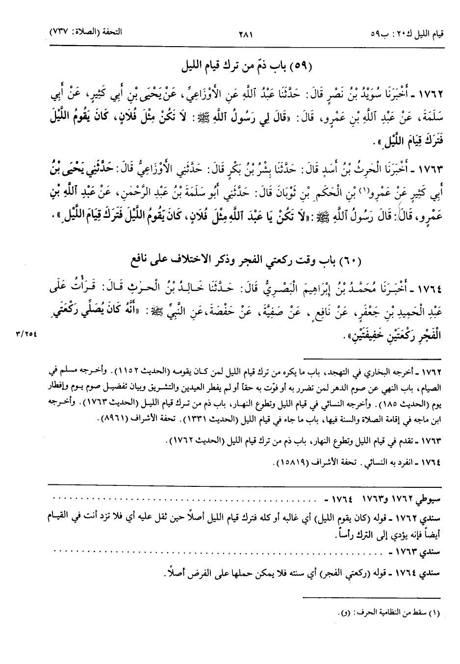 1763 - أَخْبَرَنَا الْحَارِثُ بْنُ أَسَدٍ قَالَ حَدَّثَنَا بِشْرُ بْنُ بَكْرٍ قَالَ حَدَّثَنِي الْأَوْزَاعِيُّ قَالَ حَدَّثَنِي يَحْيَى بْنُ أَبِي كَثِيرٍ عَنْ عُمَرَ بْنِ الْحَكَمِ بْنِ ثَوْبَانَ قَالَ حَدَّثَنِي أَبُو سَلَمَةَ بْنُ عَبْدِ الرَّحْمَنِ عَنْ عَبْدِ اللَّهِ بْنِ عَمْرٍو قَالَ قَالَ رَسُولُ اللَّهِ صَلَّى اللَّهُ عَلَيْهِ وَسَلَّمَ لَا تَكُنْ يَا عَبْدَ اللَّهِ مِثْلَ فُلَانٍ كَانَ يَقُومُ اللَّيْلَ فَتَرَكَ قِيَامَ اللَّيْلِ