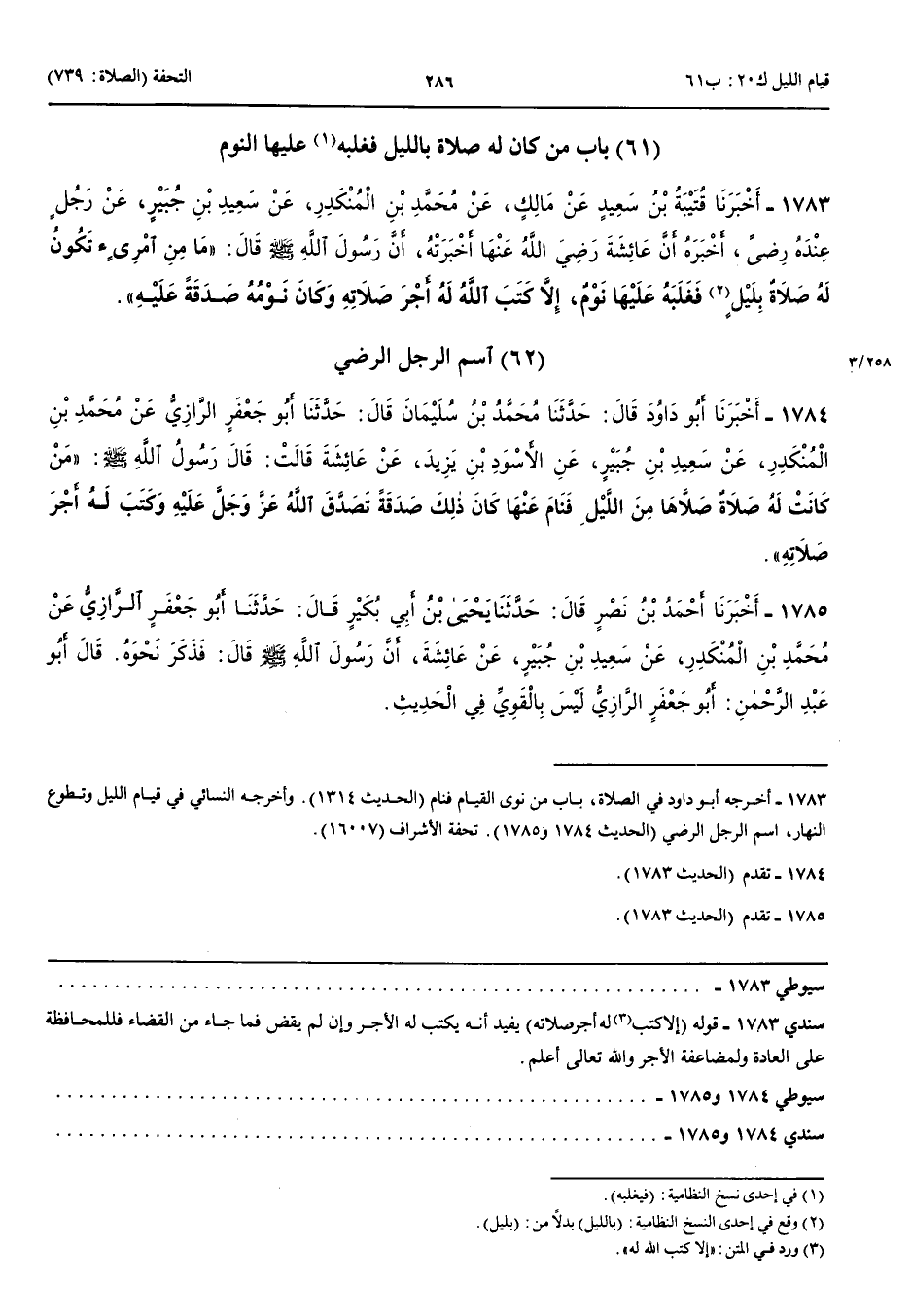 اسْمُ الرَّجُلِ الرِّضَا 1784 - أَخْبَرَنَا أَبُو دَاوُدَ قَالَ حَدَّثَنَا مُحَمَّدُ بْنُ سُلَيْمَانَ قَالَ حَدَّثَنَا أَبُو جَعْفَرٍ الرَّازِيُّ عَنْ مُحَمَّدِ بْنِ الْمُنْكَدِرِ عَنْ سَعِيدِ بْنِ جُبَيْرٍ عَنْ الْأَسْوَدِ بْنِ يَزِيدَ عَنْ عَائِشَةَ قَالَتْ قَالَ رَسُولُ اللَّهِ صَلَّى اللَّهُ عَلَيْهِ وَسَلَّمَ مَنْ كَانَتْ لَهُ صَلَاةٌ صَلَّاهَا مِنْ اللَّيْلِ فَنَامَ عَنْهَا كَانَ ذَلِكَ صَدَقَةً تَصَدَّقَ اللَّهُ عَزَّ وَجَلَّ عَلَيْهِ وَكَتَبَ لَهُ أَجْرَ صَلَاتِهِ 1785 - أَخْبَرَنَا أَحْمَدُ بْنُ نَصْرٍ قَالَ حَدَّثَنَا يَحْيَى بْنُ أَبِي بُكَيْرٍ قَالَ حَدَّثَنَا أَبُو جَعْفَرٍ الرَّازِيُّ عَنْ مُحَمَّدِ بْنِ الْمُنْكَدِرِ عَنْ سَعِيدِ بْنِ جُبَيْرٍ عَنْ عَائِشَةَ أَنَّ رَسُولَ اللَّهِ صَلَّى اللَّهُ عَلَيْهِ وَسَلَّمَ قَالَ فَذَكَرَ نَحْوَهُ قَالَ أَبُو عَبْد الرَّحْمَنِ أَبُو جَعْفَرٍ الرَّازِيُّ لَيْسَ بِالْقَوِيِّ فِي الْحَدِيثِ