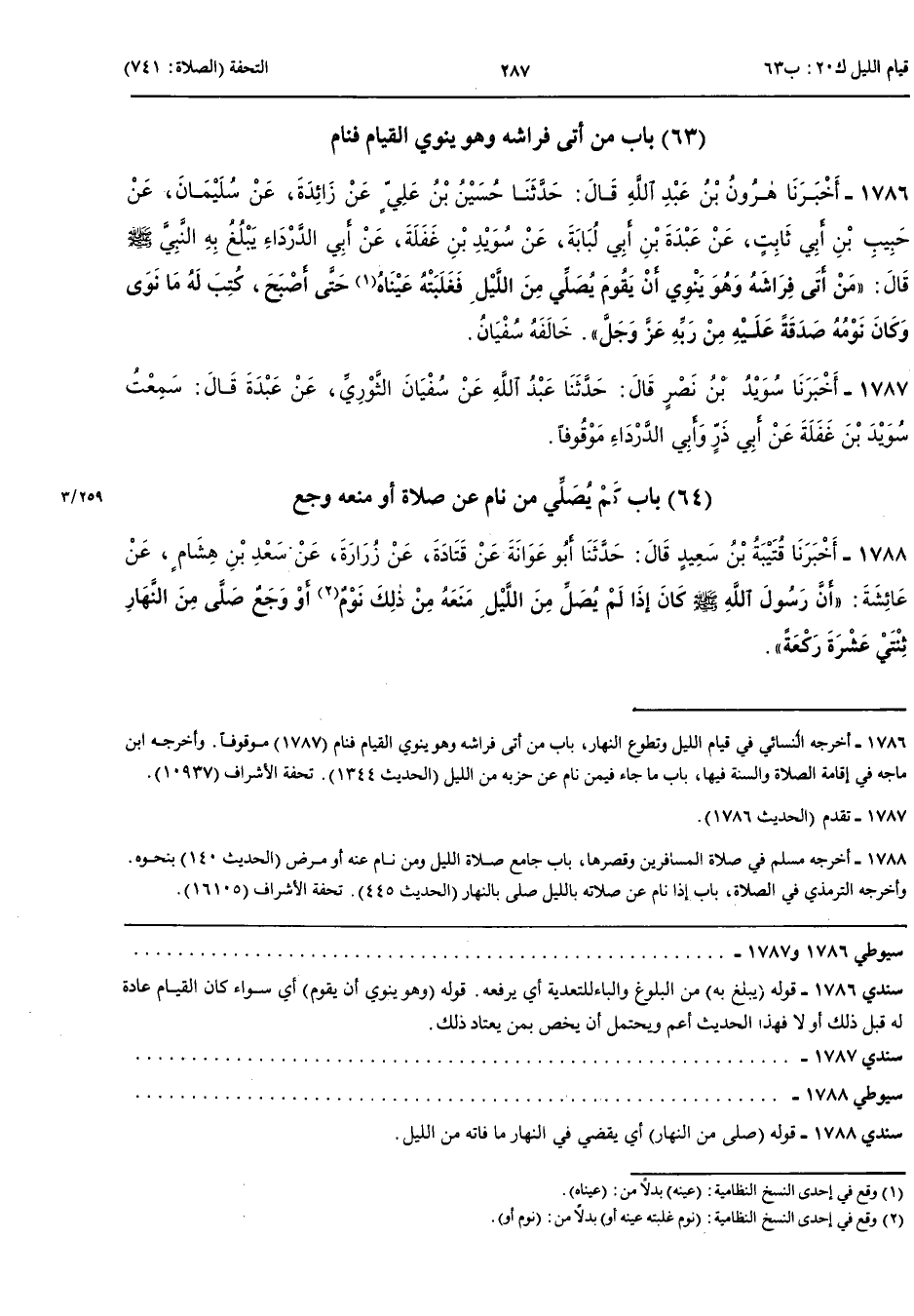 بَاب مَنْ أَتَى فِرَاشَهُ وَهُوَ يَنْوِي الْقِيَامَ فَنَامَ 1786 - أَخْبَرَنَا هَارُونُ بْنُ عَبْدِ اللَّهِ قَالَ حَدَّثَنَا حُسَيْنُ بْنُ عَلِيٍّ عَنْ زَائِدَةَ عَنْ سُلَيْمَانَ عَنْ حَبِيبِ بْنِ أَبِي ثَابِتٍ عَنْ عَبْدَةَ بْنِ أَبِي لُبَابَةَ عَنْ سُوَيْدِ بْنِ غَفَلَةَ عَنْ أَبِي الدَّرْدَاءِ يَبْلُغُ بِهِ النَّبِيَّ صَلَّى اللَّهُ عَلَيْهِ وَسَلَّمَ قَالَ مَنْ أَتَى فِرَاشَهُ وَهُوَ يَنْوِي أَنْ يَقُومَ يُصَلِّي مِنْ اللَّيْلِ فَغَلَبَتْهُ عَيْنَاهُ حَتَّى أَصْبَحَ كُتِبَ لَهُ مَا نَوَى وَكَانَ نَوْمُهُ صَدَقَةً عَلَيْهِ مِنْ رَبِّهِ عَزَّ وَجَلَّ خَالَفَهُ سُفْيَانُ أَخْبَرَنَا سُوَيْدُ بْنُ نَصْرٍ قَالَ حَدَّثَنَا عَبْدُ اللَّهِ عَنْ سُفْيَانَ الثَّوْرِيِّ عَنْ عَبْدَةَ قَالَ سَمِعْتُ سُوَيْدَ بْنَ غَفَلَةَ عَنْ أَبِي ذَرٍّ وَأَبِي الدَّرْدَاءِ مَوْقُوفًا