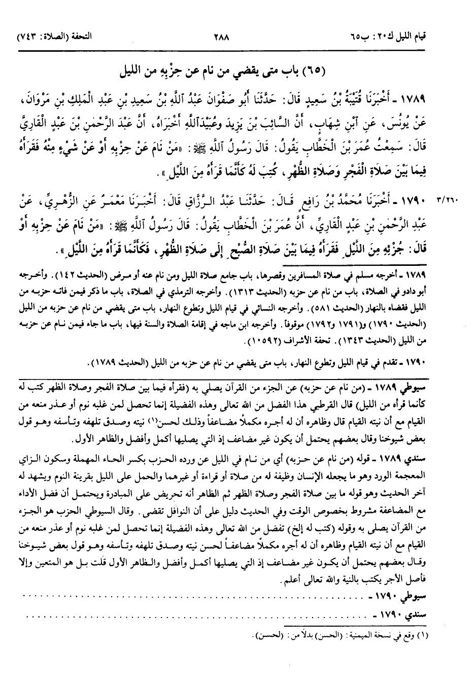 1790 - أَخْبَرَنَا مُحَمَّدُ بْنُ رَافِعٍ قَالَ حَدَّثَنَا عَبْدُ الرَّزَّاقِ قَالَ أَنْبَأَنَا مَعْمَرٌ عَنْ الزُّهْرِيِّ عَنْ عَبْدِ الرَّحْمَنِ بْنِ عَبْدٍ الْقَارِيِّ أَنَّ عُمَرَ بْنَ الْخَطَّابِ يَقُولُ قَالَ رَسُولُ اللَّهِ صَلَّى اللَّهُ عَلَيْهِ وَسَلَّمَ مَنْ نَامَ عَنْ حِزْبِهِ أَوْ قَالَ جُزْئِهِ مِنْ اللَّيْلِ فَقَرَأَهُ فِيمَا بَيْنَ صَلَاةِ الصُّبْحِ إِلَى صَلَاةِ الظُّهْرِ فَكَأَنَّمَا قَرَأَهُ مِنْ اللَّيْلِ
