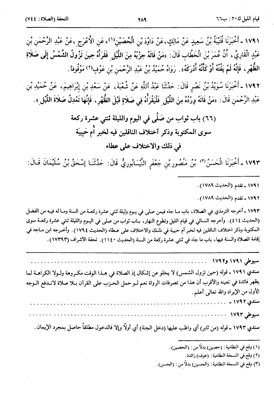 1791 - أَخْبَرَنَا قُتَيْبَةُ بْنُ سَعِيدٍ عَنْ مَالِكٍ عَنْ دَاوُدَ بْنِ الْحُصَيْنِ عَنْ الْأَعْرَجِ عَنْ عَبْدِ الرَّحْمَنِ بْنِ عَبْدٍ الْقَارِيِّ أَنَّ عُمَرَ بْنَ الْخَطَّابِ قَالَ مَنْ فَاتَهُ حِزْبُهُ مِنْ اللَّيْلِ فَقَرَأَهُ حِينَ تَزُولُ الشَّمْسُ إِلَى صَلَاةِ الظُّهْرِ فَإِنَّهُ لَمْ يَفُتْهُ أَوْ كَأَنَّهُ أَدْرَكَهُ رَوَاهُ حُمَيْدُ بْنُ عَبْدِ الرَّحْمَنِ بْنِ عَوْفٍ مَوْقُوفًا