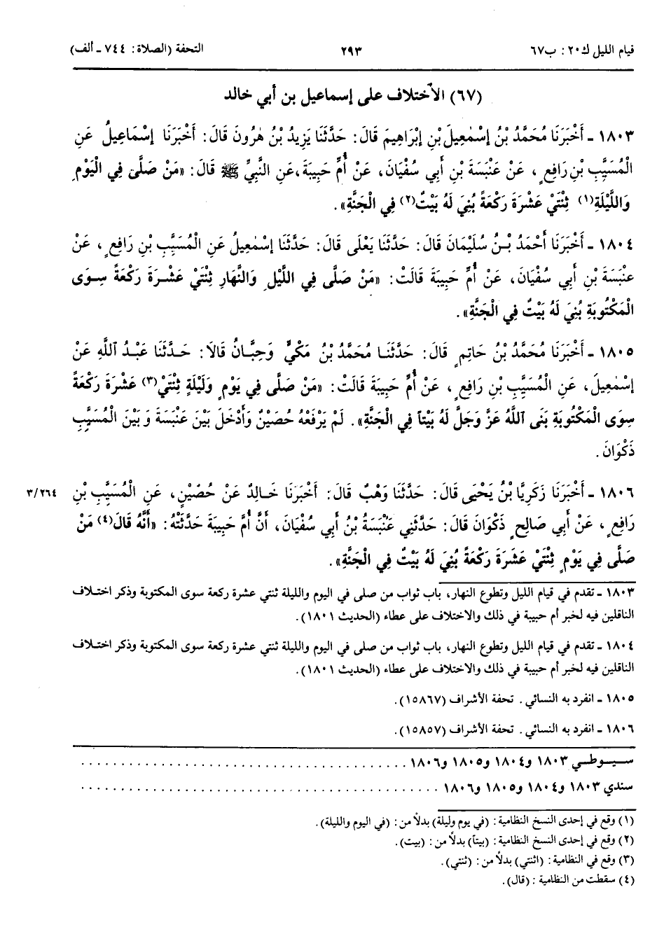 الِاخْتِلَافُ عَلَى إِسْمَعِيلَ بْنِ أَبِي خَالِدٍ 1803 - أَخْبَرَنَا مُحَمَّدُ بْنُ إِسْمَعِيلَ بْنِ إِبْرَاهِيمَ قَالَ حَدَّثَنَا يَزِيدُ بْنُ هَارُونَ قَالَ أَنْبَأَنَا إِسْمَعِيلُ عَنْ الْمُسَيَّبِ بْنِ رَافِعٍ عَنْ عَنْبَسَةَ بْنِ أَبِي سُفْيَانَ عَنْ أُمِّ حَبِيبَةَ عَنْ النَّبِيِّ صَلَّى اللَّهُ عَلَيْهِ وَسَلَّمَ قَالَ مَنْ صَلَّى فِي الْيَوْمِ وَاللَّيْلَةِ ثِنْتَيْ عَشْرَةَ رَكْعَةً بُنِيَ لَهُ بَيْتٌ فِي الْجَنَّةِ