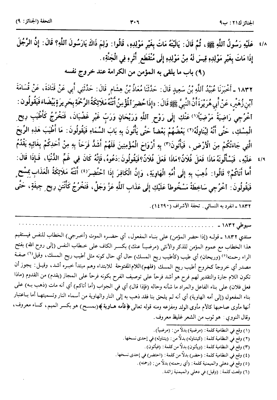 بَاب مَا يُلْقَى بِهِ الْمُؤْمِنُ مِنْ الْكَرَامَةِ عِنْدَ خُرُوجِ نَفْسِهِ 1832 - أَخْبَرَنَا عُبَيْدُ اللَّهِ بْنُ سَعِيدٍ قَالَ حَدَّثَنَا مُعَاذُ بْنُ هِشَامٍ قَالَ حَدَّثَنِي أَبِي عَنْ قَتَادَةَ عَنْ قَسَامَةَ بْنِ زُهَيْرٍ عَنْ أَبِي هُرَيْرَةَ أَنَّ النَّبِيَّ صَلَّى اللَّهُ عَلَيْهِ وَسَلَّمَ قَالَ إِذَا حُضِرَ الْمُؤْمِنُ أَتَتْهُ مَلَائِكَةُ الرَّحْمَةِ بِحَرِيرَةٍ بَيْضَاءَ فَيَقُولُونَ اخْرُجِي رَاضِيَةً مَرْضِيًّا عَنْكِ إِلَى رَوْحِ اللَّهِ وَرَيْحَانٍ وَرَبٍّ غَيْرِ غَضْبَانَ فَتَخْرُجُ كَأَطْيَبِ رِيحِ الْمِسْكِ حَتَّى أَنَّهُ لَيُنَاوِلُهُ بَعْضُهُمْ بَعْضًا حَتَّى يَأْتُونَ بِهِ بَابَ السَّمَاءِ فَيَقُولُونَ مَا أَطْيَبَ هَذِهِ الرِّيحَ الَّتِي جَاءَتْكُمْ مِنْ الْأَرْضِ فَيَأْتُونَ بِهِ أَرْوَاحَ الْمُؤْمِنِينَ فَلَهُمْ أَشَدُّ فَرَحًا بِهِ مِنْ أَحَدِكُمْ بِغَائِبِهِ يَقْدَمُ عَلَيْهِ فَيَسْأَلُونَهُ مَاذَا فَعَلَ فُلَانٌ مَاذَا فَعَلَ فُلَانٌ فَيَقُولُونَ دَعُوهُ فَإِنَّهُ كَانَ فِي غَمِّ الدُّنْيَا فَإِذَا قَالَ أَمَا أَتَاكُمْ قَالُوا ذُهِبَ بِهِ إِلَى أُمِّهِ الْهَاوِيَةِ وَإِنَّ الْكَافِرَ إِذَا احْتُضِرَ أَتَتْهُ مَلَائِكَةُ الْعَذَابِ بِمِسْحٍ فَيَقُولُونَ اخْرُجِي سَاخِطَةً مَسْخُوطًا عَلَيْكِ إِلَى عَذَابِ اللَّهِ عَزَّ وَجَلَّ فَتَخْرُجُ كَأَنْتَنِ رِيحِ جِيفَةٍ حَتَّى يَأْتُونَ بِهِ بَابَ الْأَرْضِ فَيَقُولُونَ مَا أَنْتَنَ هَذِهِ الرِّيحَ حَتَّى يَأْتُونَ بِهِ أَرْوَاحَ الْكُفَّارِ