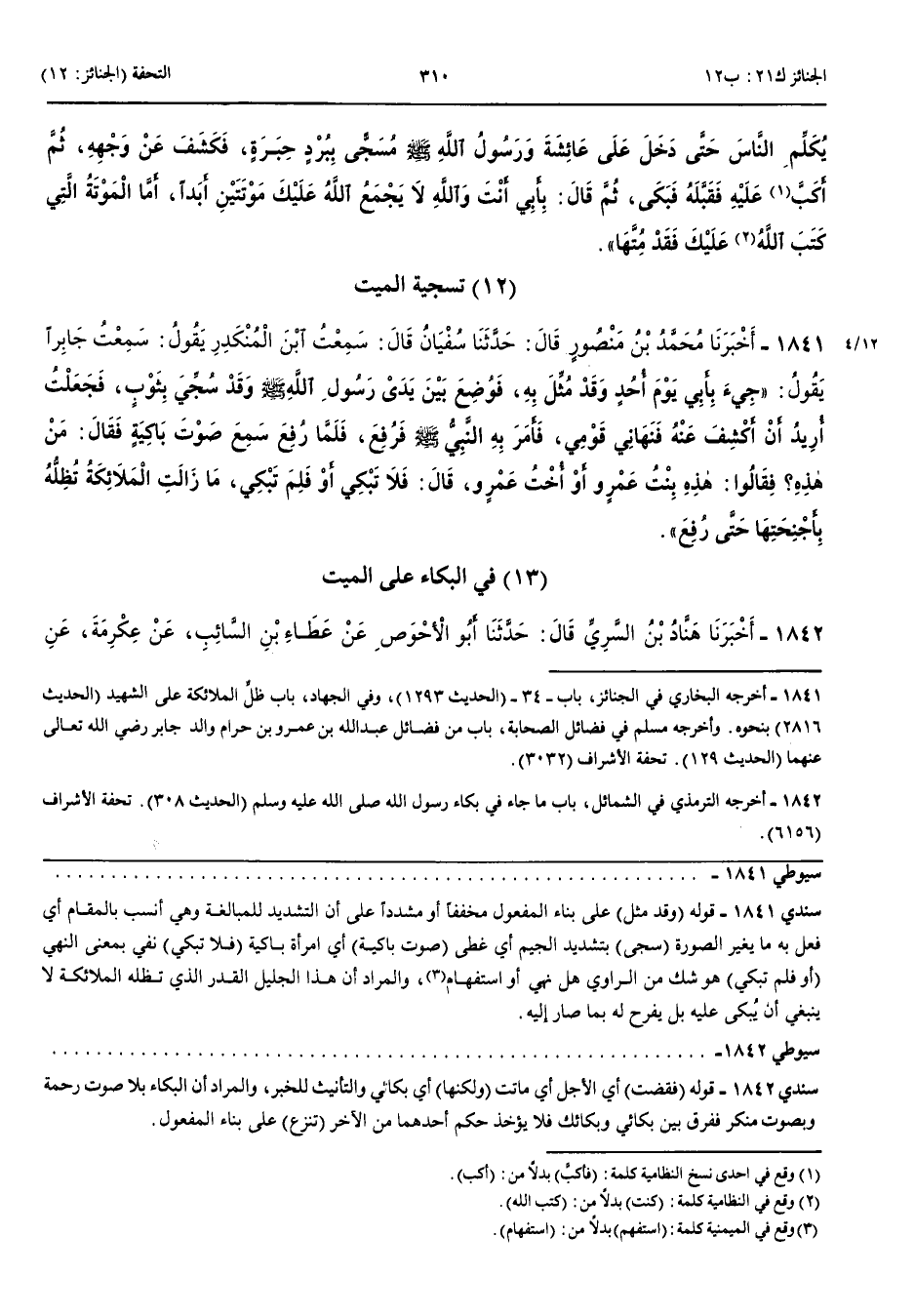 تَسْجِيَةُ الْمَيِّتِ 1841 - أَخْبَرَنِي مُحَمَّدُ بْنُ مَنْصُورٍ قَالَ حَدَّثَنَا سُفْيَانُ قَالَ سَمِعْتُ ابْنَ الْمُنْكَدِرِ يَقُولُ سَمِعْتُ جَابِرًا يَقُولُ جِيءَ بِأَبِي يَوْمَ أُحُدٍ وَقَدْ مُثِّلَ بِهِ فَوُضِعَ بَيْنَ يَدَيْ رَسُولِ اللَّهِ صَلَّى اللَّهُ عَلَيْهِ وَسَلَّمَ وَقَدْ سُجِّيَ بِثَوْبٍ فَجَعَلْتُ أُرِيدُ أَنْ أَكْشِفَ عَنْهُ فَنَهَانِي قَوْمِي فَأَمَرَ بِهِ النَّبِيُّ صَلَّى اللَّهُ عَلَيْهِ وَسَلَّمَ فَرُفِعَ فَلَمَّا رُفِعَ سَمِعَ صَوْتَ بَاكِيَةٍ فَقَالَ مَنْ هَذِهِ فَقَالُوا هَذِهِ بِنْتُ عَمْرٍو أَوْ أُخْتُ عَمْرٍو قَالَ فَلَا تَبْكِي أَوْ فَلِمَ تَبْكِي مَا زَالَتْ الْمَلَائِكَةُ تُظِلُّهُ بِأَجْنِحَتِهَا حَتَّى رُفِعَ