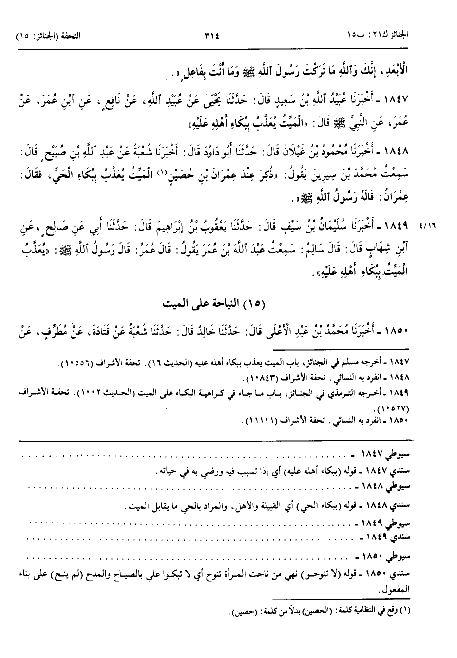النِّيَاحَةُ عَلَى الْمَيِّتِ 1850 - أَخْبَرَنَا مُحَمَّدُ بْنُ عَبْدِ الْأَعْلَى قَالَ حَدَّثَنَا خَالِدٌ قَالَ حَدَّثَنَا شُعْبَةُ عَنْ قَتَادَةَ عَنْ مُطَرِّفٍ عَنْ حَكِيمِ بْنِ قَيْسٍ أَنَّ قَيْسَ بْنَ عَاصِمٍ قَالَ لَا تَنُوحُوا عَلَيَّ فَإِنَّ رَسُولَ اللَّهِ صَلَّى اللَّهُ عَلَيْهِ وَسَلَّمَ لَمْ يُنَحْ عَلَيْهِ مُخْتَصَرٌ