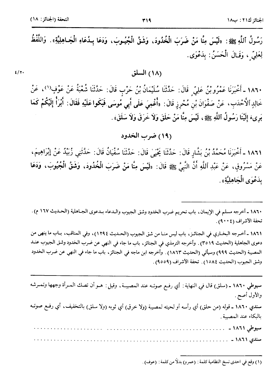 ضَرْبُ الْخُدُودِ 1861 - أَخْبَرَنَا مُحَمَّدُ بْنُ بَشَّارٍ قَالَ حَدَّثَنَا يَحْيَى قَالَ حَدَّثَنَا سُفْيَانُ قَالَ حَدَّثَنِي زُبَيْدٌ عَنْ إِبْرَاهِيمَ عَنْ مَسْرُوقٍ عَنْ عَبْدِ اللَّهِ أَنَّ النَّبِيَّ صَلَّى اللَّهُ عَلَيْهِ وَسَلَّمَ قَالَ لَيْسَ مِنَّا مَنْ ضَرَبَ الْخُدُودَ وَشَقَّ الْجُيُوبَ وَدَعَا بِدَعْوَى الْجَاهِلِيَّةِ