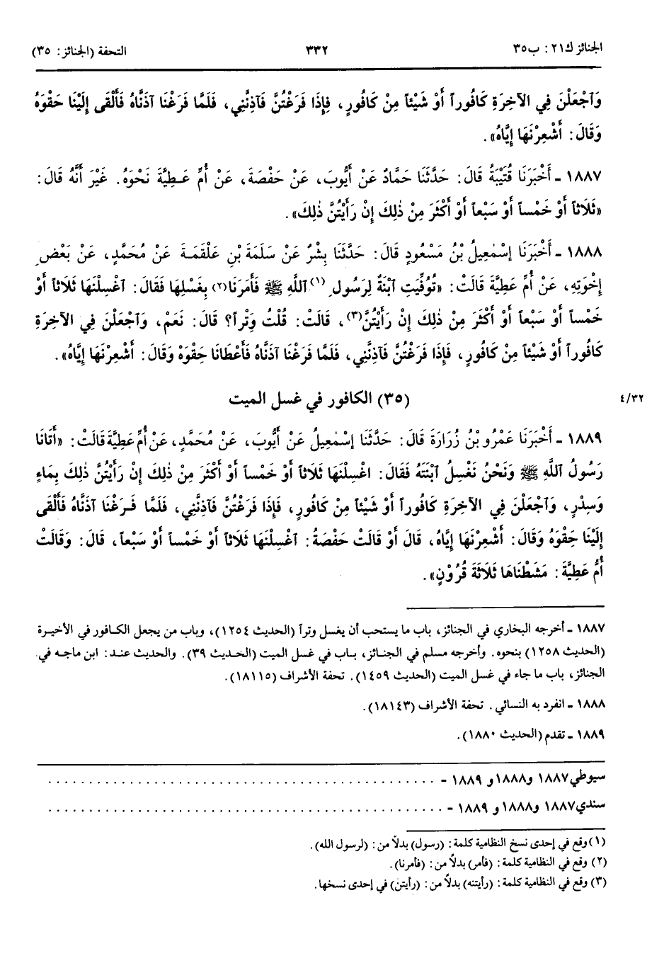 الْكَافُورُ فِي غَسْلِ الْمَيِّتِ 1889 - أَخْبَرَنَا عَمْرُو بْنُ زُرَارَةَ قَالَ حَدَّثَنَا إِسْمَعِيلُ عَنْ أَيُّوبَ عَنْ مُحَمَّدٍ عَنْ أُمِّ عَطِيَّةَ قَالَتْ أَتَانَا رَسُولُ اللَّهِ صَلَّى اللَّهُ عَلَيْهِ وَسَلَّمَ وَنَحْنُ نَغْسِلُ ابْنَتَهُ فَقَالَ اغْسِلْنَهَا ثَلَاثًا أَوْ خَمْسًا أَوْ أَكْثَرَ مِنْ ذَلِكِ إِنْ رَأَيْتُنَّ ذَلِكِ بِمَاءٍ وَسِدْرٍ وَاجْعَلْنَ فِي الْآخِرَةِ كَافُورًا أَوْ شَيْئًا مِنْ كَافُورٍ فَإِذَا فَرَغْتُنَّ فَآذِنَّنِي فَلَمَّا فَرَغْنَا آذَنَّاهُ فَأَلْقَى إِلَيْنَا حِقْوَهُ وَقَالَ أَشْعِرْنَهَا إِيَّاهُ قَالَ أَوْ قَالَتْ حَفْصَةُ اغْسِلْنَهَا ثَلَاثًا أَوْ خَمْسًا أَوْ سَبْعًا قَالَ وَقَالَتْ أُمُّ عَطِيَّةَ مَشَطْنَاهَا ثَلَاثَةَ قُرُونٍ أَخْبَرَنَا مُحَمَّدُ بْنُ مَنْصُورٍ قَالَ حَدَّثَنَا سُفْيَانُ قَالَ حَدَّثَنَا أَيُّوبُ عَنْ مُحَمَّدٍ قَالَ أَخْبَرَتْنِي حَفْصَةُ عَنْ أُمِّ عَطِيَّةَ قَالَتْ وَجَعَلْنَا رَأْسَهَا ثَلَاثَةَ قُرُونٍ أَخْبَرَنَا قُتَيْبَةُ بْنُ سَعِيدٍ قَالَ حَدَّثَنَا حَمَّادٌ عَنْ أَيُّوبَ وَقَالَتْ حَفْصَةُ عَنْ أُمِّ عَطِيَّةَ وَجَعَلْنَا رَأْسَهَا ثَلَاثَةَ قُرُونٍ