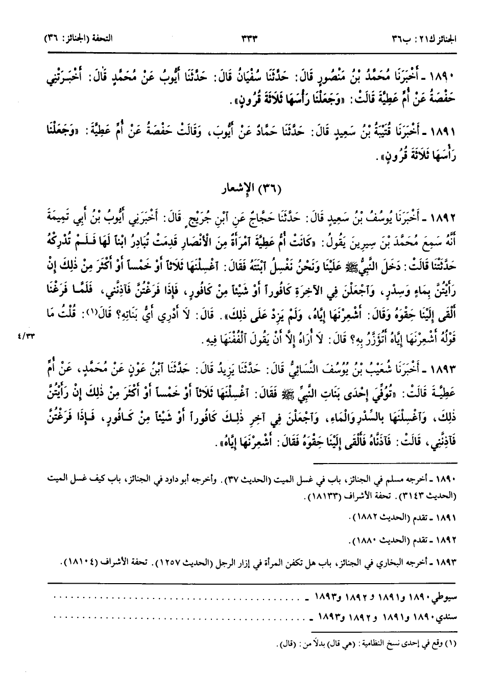 الْإِشْعَارُ 1892 - أَخْبَرَنَا يُوسُفُ بْنُ سَعِيدٍ قَالَ حَدَّثَنَا حَجَّاجٌ عَنْ ابْنِ جُرَيْجٍ قَالَ أَخْبَرَنِي أَيُّوبُ بْنُ أَبِي تَمِيمَةَ أَنَّهُ سَمِعَ مُحَمَّدَ بْنَ سِيرِينَ يَقُولُ كَانَتْ أُمُّ عَطِيَّةَ امْرَأَةٌ مِنْ الْأَنْصَارِ قَدِمَتْ تُبَادِرُ ابْنًا لَهَا فَلَمْ تُدْرِكْهُ حَدَّثَتْنَا قَالَتْ دَخَلَ النَّبِيُّ صَلَّى اللَّهُ عَلَيْهِ وَسَلَّمَ عَلَيْنَا وَنَحْنُ نَغْسِلُ ابْنَتَهُ فَقَالَ اغْسِلْنَهَا ثَلَاثًا أَوْ خَمْسًا أَوْ أَكْثَرَ مِنْ ذَلِكِ إِنْ رَأَيْتُنَّ بِمَاءٍ وَسِدْرٍ وَاجْعَلْنَ فِي الْآخِرَةِ كَافُورًا أَوْ شَيْئًا مِنْ كَافُورٍ فَإِذَا فَرَغْتُنَّ فَآذِنَّنِي فَلَمَّا فَرَغْنَا أَلْقَى إِلَيْنَا حِقْوَهُ وَقَالَ أَشْعِرْنَهَا إِيَّاهُ وَلَمْ يَزِدْ عَلَى ذَلِكَ قَالَ لَا أَدْرِي أَيُّ بَنَاتِهِ قَالَ قُلْتُ مَا قَوْلُهُ أَشْعِرْنَهَا إِيَّاهُ أَتُؤَزَّرُ بِهِ قَالَ لَا أُرَاهُ إِلَّا أَنْ يَقُولَ الْفُفْنَهَا فِيهِ