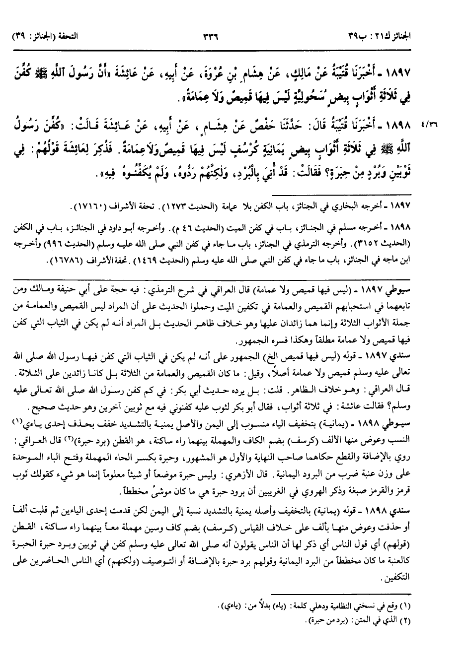 1898 - أَخْبَرَنَا قُتَيْبَةُ قَالَ حَدَّثَنَا حَفْصٌ عَنْ هِشَامٍ عَنْ أَبِيهِ عَنْ عَائِشَةَ قَالَتْ كُفِّنَ رَسُولُ اللَّهِ صَلَّى اللَّهُ عَلَيْهِ وَسَلَّمَ فِي ثَلَاثَةِ أَثْوَابٍ بِيضٍ يَمَانِيَةٍ كُرْسُفٍ لَيْسَ فِيهَا قَمِيصٌ وَلَا عِمَامَةٌ فَذُكِرَ لِعَائِشَةَ قَوْلُهُمْ فِي ثَوْبَيْنِ وَبُرْدٍ مِنْ حِبَرَةٍ فَقَالَتْ قَدْ أُتِيَ بِالْبُرْدِ وَلَكِنَّهُمْ رَدُّوهُ وَلَمْ يُكَفِّنُوهُ فِيهِ