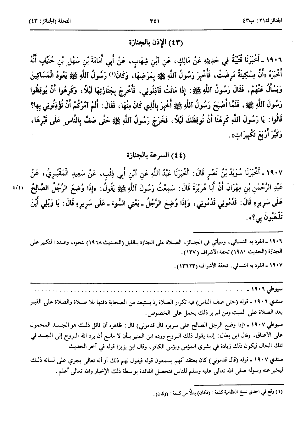 الْإِذْنُ بِالْجَنَازَةِ 1906 - أَخْبَرَنَا قُتَيْبَةُ فِي حَدِيثِهِ عَنْ مَالِكٍ عَنْ ابْنِ شِهَابٍ عَنْ أَبِي أُمَامَةَ بْنِ سَهْلِ بْنِ حُنَيْفٍ أَنَّهُ أَخْبَرَهُ أَنَّ مِسْكِينَةً مَرِضَتْ فَأُخْبِرَ رَسُولُ اللَّهِ صَلَّى اللَّهُ عَلَيْهِ وَسَلَّمَ بِمَرَضِهَا وَكَانَ رَسُولُ اللَّهِ صَلَّى اللَّهُ عَلَيْهِ وَسَلَّمَ يَعُودُ الْمَسَاكِينَ وَيَسْأَلُ عَنْهُمْ فَقَالَ رَسُولُ اللَّهِ صَلَّى اللَّهُ عَلَيْهِ وَسَلَّمَ إِذَا مَاتَتْ فَآذِنُونِي فَأُخْرِجَ بِجَنَازَتِهَا لَيْلًا وَكَرِهُوا أَنْ يُوقِظُوا رَسُولَ اللَّهِ صَلَّى اللَّهُ عَلَيْهِ وَسَلَّمَ فَلَمَّا أَصْبَحَ رَسُولُ اللَّهِ صَلَّى اللَّهُ عَلَيْهِ وَسَلَّمَ أُخْبِرَ بِالَّذِي كَانَ مِنْهَا فَقَالَ أَلَمْ آمُرْكُمْ أَنْ تُؤْذِنُونِي بِهَا قَالُوا يَا رَسُولَ اللَّهِ كَرِهْنَا أَنْ نُوقِظَكَ لَيْلًا فَخَرَجَ رَسُولُ اللَّهِ صَلَّى اللَّهُ عَلَيْهِ وَسَلَّمَ حَتَّى صَفَّ بِالنَّاسِ عَلَى قَبْرِهَا وَكَبَّرَ أَرْبَعَ تَكْبِيرَاتٍ