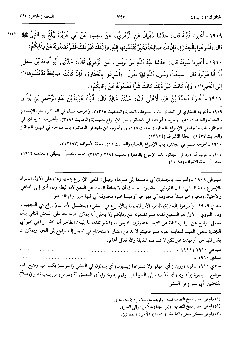 1909 - أَخْبَرَنَا قُتَيْبَةُ قَالَ حَدَّثَنَا سُفْيَانُ عَنْ الزُّهْرِيِّ عَنْ سَعِيدٍ عَنْ أَبِي هُرَيْرَةَ يَبْلُغُ بِهِ النَّبِيَّ صَلَّى اللَّهُ عَلَيْهِ وَسَلَّمَ قَالَ أَسْرِعُوا بِالْجَنَازَةِ فَإِنْ تَكُ صَالِحَةً فَخَيْرٌ تُقَدِّمُونَهَا إِلَيْهِ وَإِنْ تَكُ غَيْرَ ذَلِكَ فَشَرٌّ تَضَعُونَهُ عَنْ رِقَابِكُمْ