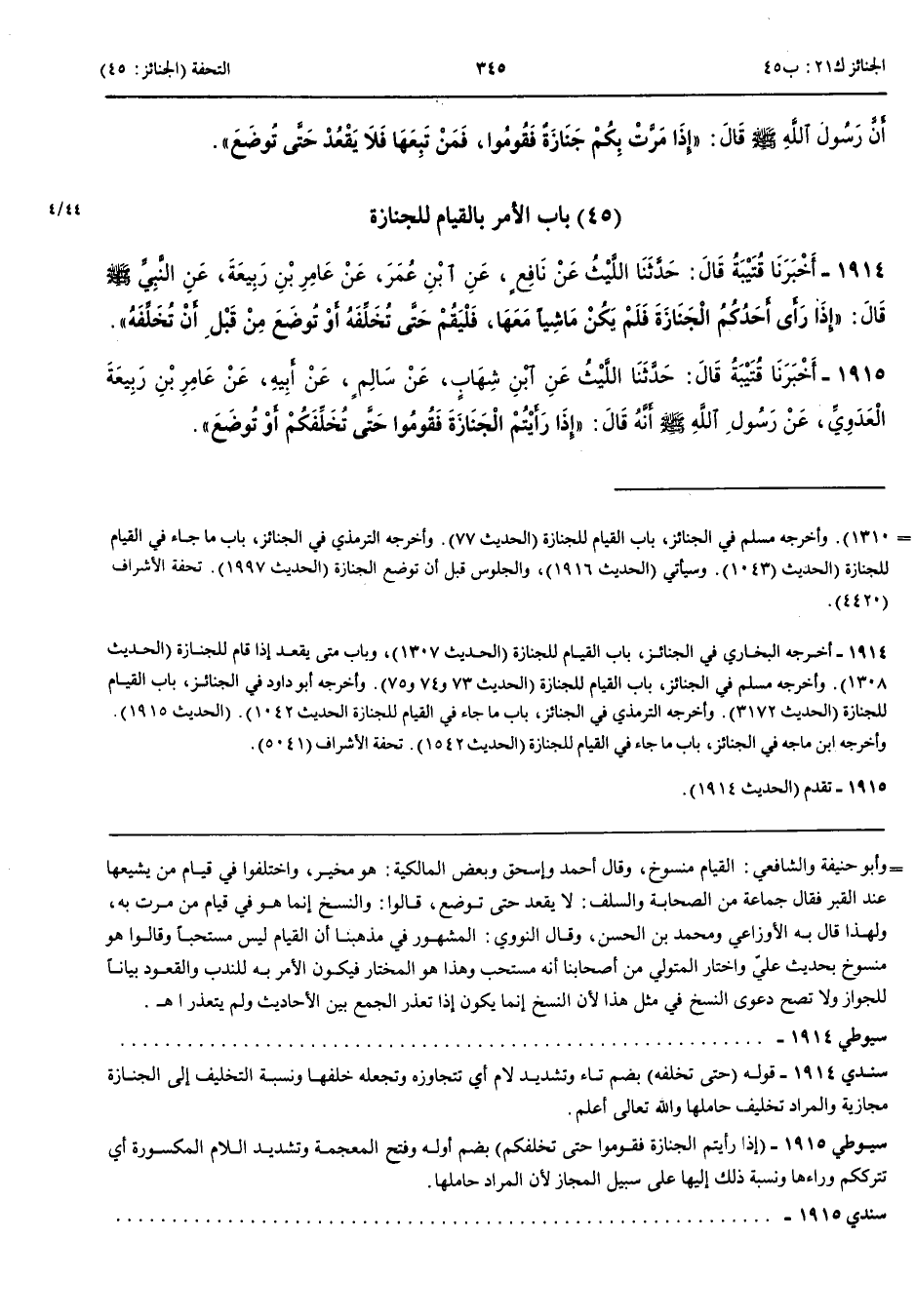 بَاب الْأَمْرِ بِالْقِيَامِ لِلْجَنَازَةِ 1914 - أَخْبَرَنَا قُتَيْبَةُ قَالَ حَدَّثَنَا اللَّيْثُ عَنْ نَافِعٍ عَنْ ابْنِ عُمَرَ عَنْ عَامِرِ بْنِ رَبِيعَةَ عَنْ النَّبِيِّ صَلَّى اللَّهُ عَلَيْهِ وَسَلَّمَ قَالَ إِذَا رَأَى أَحَدُكُمْ الْجَنَازَةَ فَلَمْ يَكُنْ مَاشِيًا مَعَهَا فَلْيَقُمْ حَتَّى تُخَلِّفَهُ أَوْ تُوضَعَ مِنْ قَبْلِ أَنْ تُخَلِّفَهُ