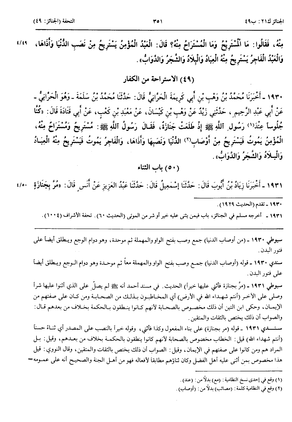 الِاسْتِرَاحَةُ مِنْ الْكُفَّارِ 1930 - أَخْبَرَنَا مُحَمَّدُ بْنُ وَهْبِ بْنِ أَبِي كَرِيمَةَ الْحَرَّانِيُّ قَالَ حَدَّثَنَا مُحَمَّدُ بْنُ سَلَمَةَ وَهُوَ الْحَرَّانِيُّ عَنْ أَبِي عَبْدِ الرَّحِيمِ حَدَّثَنِي زَيْدٌ عَنْ وَهْبِ بْنِ كَيْسَانَ عَنْ مَعْبَدِ بْنِ كَعْبٍ عَنْ أَبِي قَتَادَةَ قَالَ كُنَّا جُلُوسًا عِنْدَ رَسُولِ اللَّهِ صَلَّى اللَّهُ عَلَيْهِ وَسَلَّمَ إِذْ طَلَعَتْ جَنَازَةٌ فَقَالَ رَسُولُ اللَّهِ صَلَّى اللَّهُ عَلَيْهِ وَسَلَّمَ مُسْتَرِيحٌ وَمُسْتَرَاحٌ مِنْهُ الْمُؤْمِنُ يَمُوتُ فَيَسْتَرِيحُ مِنْ أَوْصَابِ الدُّنْيَا وَنَصَبِهَا وَأَذَاهَا وَالْفَاجِرُ يَمُوتُ فَيَسْتَرِيحُ مِنْهُ الْعِبَادُ وَالْبِلَادُ وَالشَّجَرُ وَالدَّوَابُّ