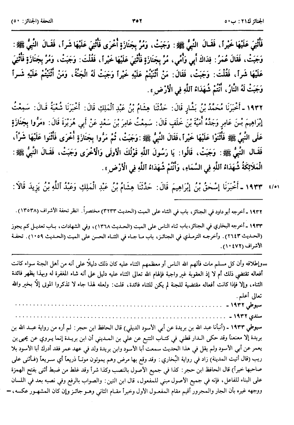 1933 - أَخْبَرَنَا إِسْحَقُ بْنُ إِبْرَاهِيمَ قَالَ حَدَّثَنَا هِشَامُ بْنُ عَبْدِ الْمَلِكِ وَعَبْدُ اللَّهِ بْنُ يَزِيدَ قَالَا حَدَّثَنَا دَاوُدُ بْنُ أَبِي الْفُرَاتِ قَالَ حَدَّثَنَا عَبْدُ اللَّهِ بْنُ بُرَيْدَةَ عَنْ أَبِي الْأَسْوَدِ الدِّيْلِيِّ قَالَ أَتَيْتُ الْمَدِينَةَ فَجَلَسْتُ إِلَى عُمَرَ بْنِ الْخَطَّابِ فَمُرَّ بِجَنَازَةٍ فَأُثْنِيَ عَلَى صَاحِبِهَا خَيْرًا فَقَالَ عُمَرُ وَجَبَتْ ثُمَّ مُرَّ بِأُخْرَى فَأُثْنِيَ عَلَى صَاحِبِهَا خَيْرًا فَقَالَ عُمَرُ وَجَبَتْ ثُمَّ مُرَّ بِالثَّالِثِ فَأُثْنِيَ عَلَى صَاحِبِهَا شَرًّا فَقَالَ عُمَرُ وَجَبَتْ فَقُلْتُ وَمَا وَجَبَتْ يَا أَمِيرَ الْمُؤْمِنِينَ قَالَ قُلْتُ كَمَا قَالَ رَسُولُ اللَّهِ صَلَّى اللَّهُ عَلَيْهِ وَسَلَّمَ أَيُّمَا مُسْلِمٍ شَهِدَ لَهُ أَرْبَعَةٌ قَالُوا خَيْرًا أَدْخَلَهُ اللَّهُ الْجَنَّةَ قُلْنَا أَوْ ثَلَاثَةٌ قَالَ أَوْ ثَلَاثَةٌ قُلْنَا أَوْ اثْنَانِ قَالَ أَوْ اثْنَانِ