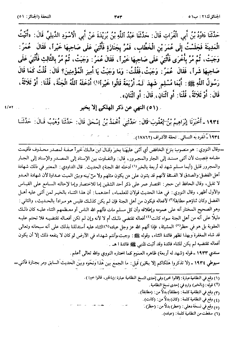 النَّهْيُ عَنْ ذِكْرِ الْهَلْكَى إِلَّا بِخَيْرٍ 1934 - أَخْبَرَنَا إِبْرَاهِيمُ بْنُ يَعْقُوبَ قَالَ حَدَّثَنِي أَحْمَدُ بْنُ إِسْحَقَ قَالَ حَدَّثَنَا وُهَيْبٌ قَالَ حَدَّثَنَا مَنْصُورُ بْنُ عَبْدِ الرَّحْمَنِ عَنْ أُمِّهِ عَنْ عَائِشَةَ قَالَتْ ذُكِرَ عِنْدَ النَّبِيِّ صَلَّى اللَّهُ عَلَيْهِ وَسَلَّمَ هَالِكٌ بِسُوءٍ فَقَالَ لَا تَذْكُرُوا هَلْكَاكُمْ إِلَّا بِخَيْرٍ