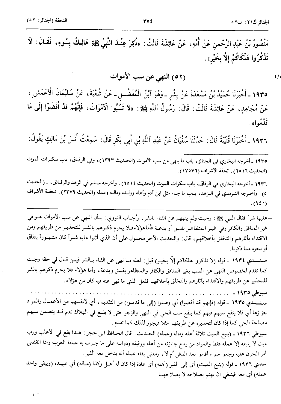 النَّهْيُ عَنْ سَبِّ الْأَمْوَاتِ 1935 - أَخْبَرَنَا حُمَيْدُ بْنُ مَسْعَدَةَ عَنْ بِشْرٍ وَهُوَ ابْنُ الْمُفَضَّلِ عَنْ شُعْبَةَ عَنْ سُلَيْمَانَ الْأَعْمَشِ عَنْ مُجَاهِدٍ عَنْ عَائِشَةَ قَالَتْ قَالَ رَسُولُ اللَّهِ صَلَّى اللَّهُ عَلَيْهِ وَسَلَّمَ لَا تَسُبُّوا الْأَمْوَاتَ فَإِنَّهُمْ قَدْ أَفْضَوْا إِلَى مَا قَدَّمُوا