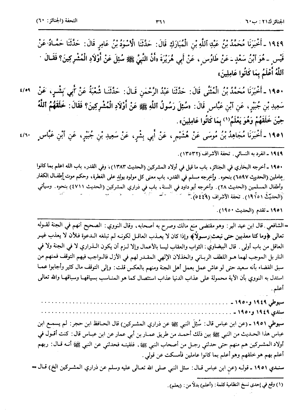 1951 - أَخْبَرَنِي مُجَاهِدُ بْنُ مُوسَى عَنْ هُشَيْمٍ عَنْ أَبِي بِشْرٍ عَنْ سَعِيدِ بْنِ جُبَيْرٍ عَنْ ابْنِ عَبَّاسٍ قَالَ سُئِلَ النَّبِيُّ صَلَّى اللَّهُ عَلَيْهِ وَسَلَّمَ عَنْ ذَرَارِيِّ الْمُشْرِكِينَ فَقَالَ اللَّهُ أَعْلَمُ بِمَا كَانُوا عَامِلِينَ