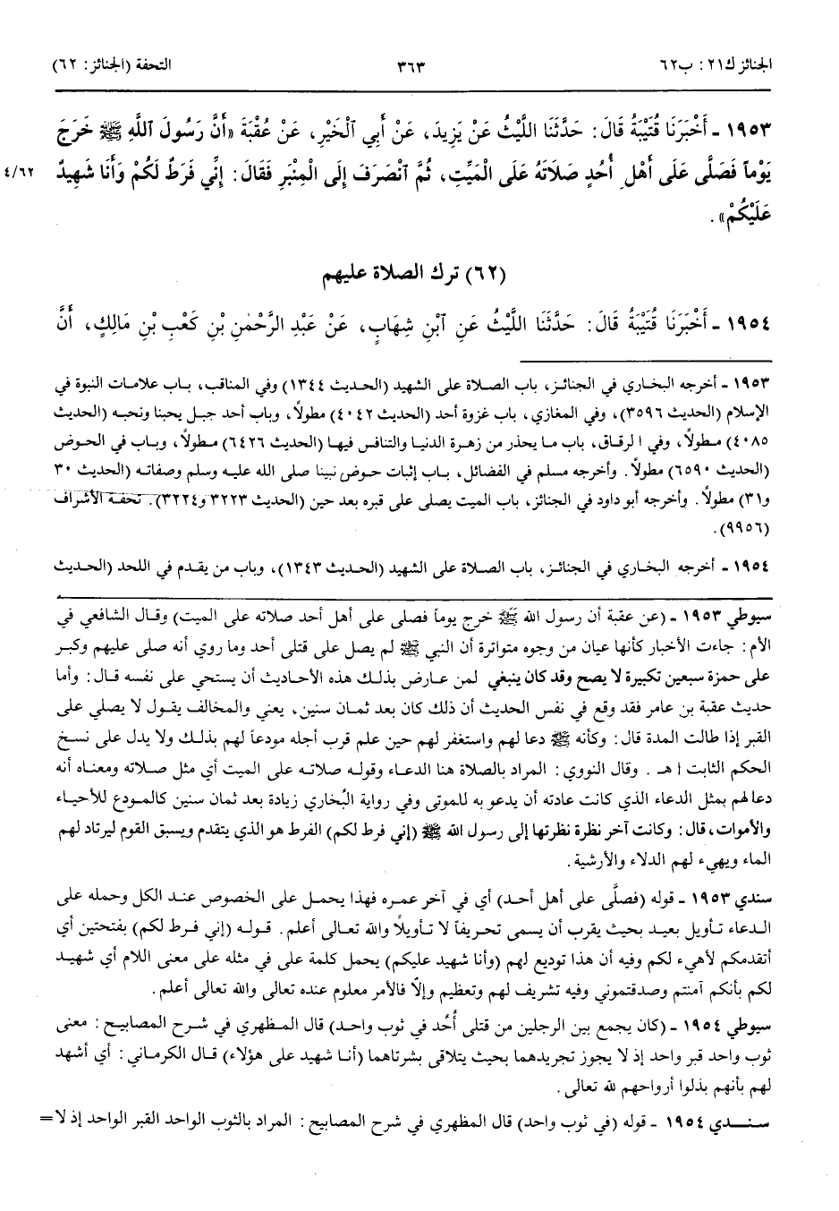 تَرْكُ الصَّلَاةِ عَلَيْهِمْ 1954 - أَخْبَرَنَا قُتَيْبَةُ قَالَ حَدَّثَنَا اللَّيْثُ عَنْ ابْنِ شِهَابٍ عَنْ عَبْدِ الرَّحْمَنِ بْنِ كَعْبِ بْنِ مَالِكٍ أَنَّ جَابِرَ بْنَ عَبْدِ اللَّهِ أَخْبَرَهُ أَنَّ رَسُولَ اللَّهِ صَلَّى اللَّهُ عَلَيْهِ وَسَلَّمَ كَانَ يَجْمَعُ بَيْنَ الرَّجُلَيْنِ مِنْ قَتْلَى أُحُدٍ فِي ثَوْبٍ وَاحِدٍ ثُمَّ يَقُولُ أَيُّهُمَا أَكْثَرُ أَخْذًا لِلْقُرْآنِ فَإِذَا أُشِيرَ إِلَى أَحَدِهِمَا قَدَّمَهُ فِي اللَّحْدِ قَالَ أَنَا شَهِيدٌ عَلَى هَؤُلَاءِ وَأَمَرَ بِدَفْنِهِمْ فِي دِمَائِهِمْ وَلَمْ يُصَلِّ عَلَيْهِمْ وَلَمْ يُغَسَّلُوا