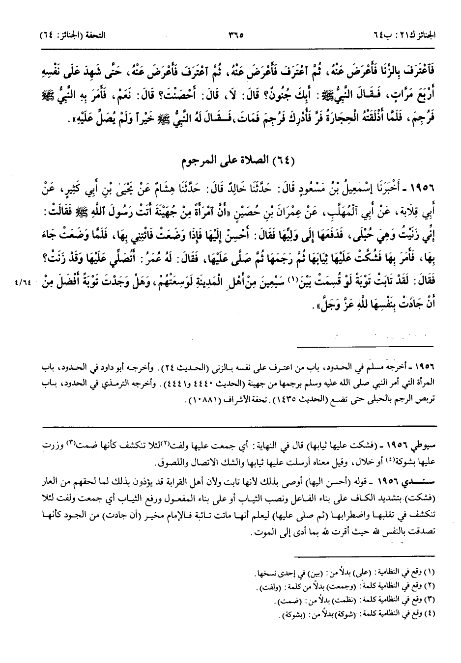 الصَّلَاةُ عَلَى الْمَرْجُومِ 1956 - أَخْبَرَنَا إِسْمَعِيلُ بْنُ مَسْعُودٍ قَالَ حَدَّثَنَا خَالِدٌ قَالَ حَدَّثَنَا هِشَامٌ عَنْ يَحْيَى بْنِ أَبِي كَثِيرٍ عَنْ أَبِي قِلَابَةَ عَنْ أَبِي الْمُهَلَّبِ عَنْ عِمْرَانَ بْنِ حُصَيْنٍ أَنَّ امْرَأَةً مِنْ جُهَيْنَةَ أَتَتْ رَسُولَ اللَّهِ صَلَّى اللَّهُ عَلَيْهِ وَسَلَّمَ فَقَالَتْ إِنِّي زَنَيْتُ وَهِيَ حُبْلَى فَدَفَعَهَا إِلَى وَلِيِّهَا فَقَالَ أَحْسِنْ إِلَيْهَا فَإِذَا وَضَعَتْ فَأْتِنِي بِهَا فَلَمَّا وَضَعَتْ جَاءَ بِهَا فَأَمَرَ بِهَا فَشُكَّتْ عَلَيْهَا ثِيَابُهَا ثُمَّ رَجَمَهَا ثُمَّ صَلَّى عَلَيْهَا فَقَالَ لَهُ عُمَرُ أَتُصَلِّي عَلَيْهَا وَقَدْ زَنَتْ فَقَالَ لَقَدْ تَابَتْ تَوْبَةً لَوْ قُسِمَتْ بَيْنَ سَبْعِينَ مِنْ أَهْلِ الْمَدِينَةِ لَوَسِعَتْهُمْ وَهَلْ وَجَدْتَ تَوْبَةً أَفْضَلَ مِنْ أَنْ جَادَتْ بِنَفْسِهَا لِلَّهِ عَزَّ وَجَلَّ