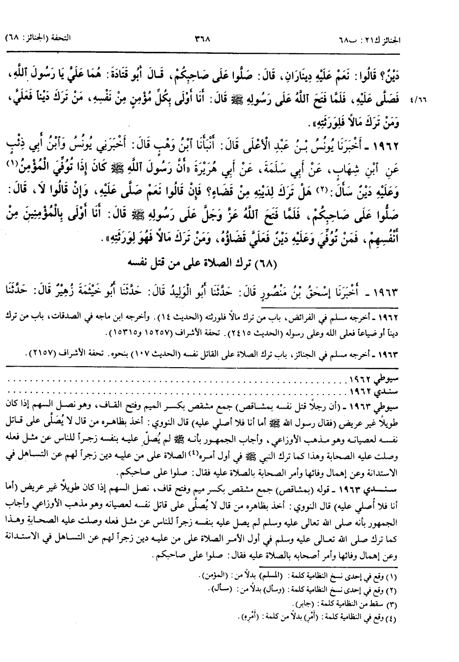 1962 - أَخْبَرَنَا يُونُسُ بْنُ عَبْدِ الْأَعْلَى قَالَ أَنْبَأَنَا ابْنُ وَهْبٍ قَالَ أَخْبَرَنِي يُونُسُ وَابْنُ أَبِي ذِئْبٍ عَنْ ابْنِ شِهَابٍ عَنْ أَبِي سَلَمَةَ عَنْ أَبِي هُرَيْرَةَ أَنَّ رَسُولَ اللَّهِ صَلَّى اللَّهُ عَلَيْهِ وَسَلَّمَ كَانَ إِذَا تُوُفِّيَ الْمُؤْمِنُ وَعَلَيْهِ دَيْنٌ سَأَلَ هَلْ تَرَكَ لِدَيْنِهِ مِنْ قَضَاءٍ فَإِنْ قَالُوا نَعَمْ صَلَّى عَلَيْهِ وَإِنْ قَالُوا لَا قَالَ صَلُّوا عَلَى صَاحِبِكُمْ فَلَمَّا فَتَحَ اللَّهُ عَزَّ وَجَلَّ عَلَى رَسُولِهِ صَلَّى اللَّهُ عَلَيْهِ وَسَلَّمَ قَالَ أَنَا أَوْلَى بِالْمُؤْمِنِينَ مِنْ أَنْفُسِهِمْ فَمَنْ تُوُفِّيَ وَعَلَيْهِ دَيْنٌ فَعَلَيَّ قَضَاؤُهُ وَمَنْ تَرَكَ مَالًا فَهُوَ لِوَرَثَتِهِ