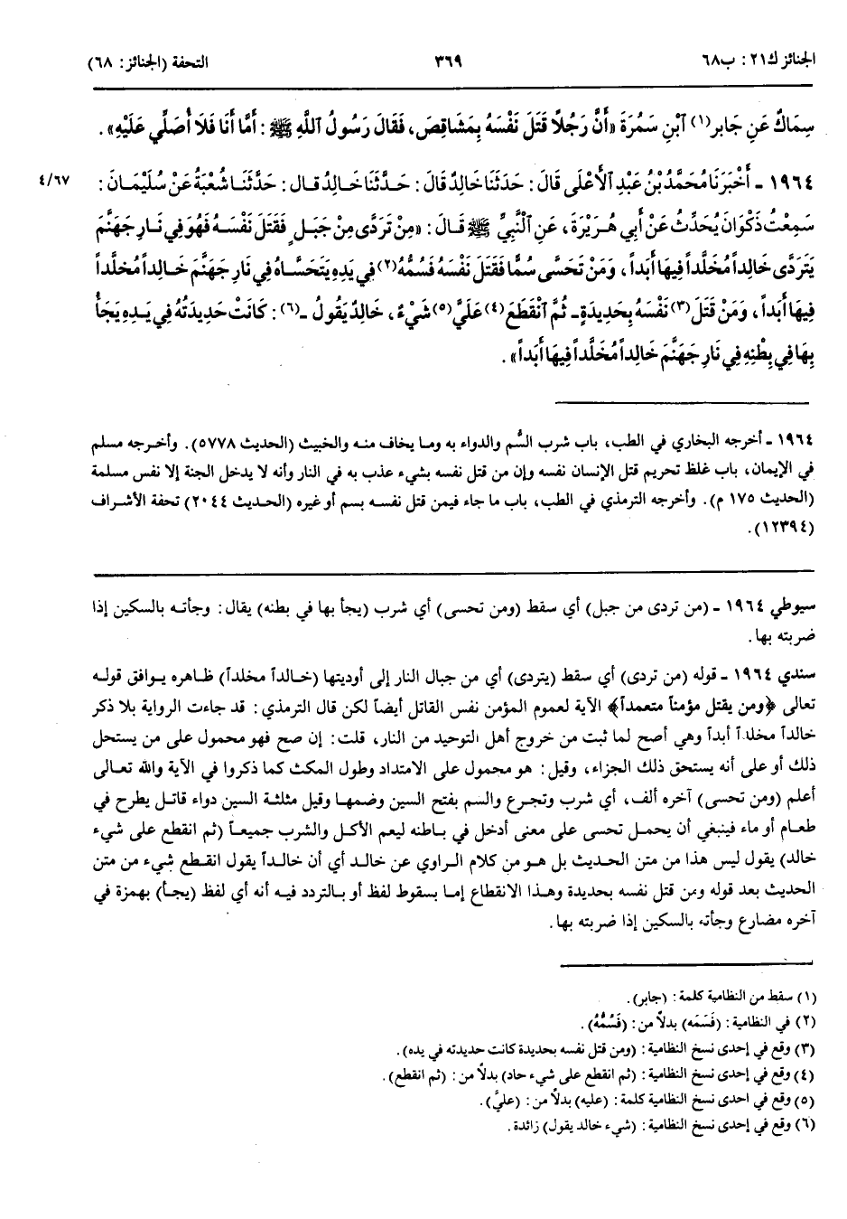 1964 - أَخْبَرَنَا مُحَمَّدُ بْنُ عَبْدِ الْأَعْلَى قَالَ حَدَّثَنَا خَالِدٌ قَالَ حَدَّثَنَا شُعْبَةُ عَنْ سُلَيْمَانَ سَمِعْتُ ذَكْوَانَ يُحَدِّثُ عَنْ أَبِي هُرَيْرَةَ عَنْ النَّبِيِّ صَلَّى اللَّهُ عَلَيْهِ وَسَلَّمَ قَالَ مَنْ تَرَدَّى مِنْ جَبَلٍ فَقَتَلَ نَفْسَهُ فَهُوَ فِي نَارِ جَهَنَّمَ يَتَرَدَّى خَالِدًا مُخَلَّدًا فِيهَا أَبَدًا وَمَنْ تَحَسَّى سُمًّا فَقَتَلَ نَفْسَهُ فَسُمُّهُ فِي يَدِهِ يَتَحَسَّاهُ فِي نَارِ جَهَنَّمَ خَالِدًا مُخَلَّدًا فِيهَا أَبَدًا وَمَنْ قَتَلَ نَفْسَهُ بِحَدِيدَةٍ ثُمَّ انْقَطَعَ عَلَيَّ شَيْءٌ خَالِدٌ يَقُولُ كَانَتْ حَدِيدَتُهُ فِي يَدِهِ يَجَأُ بِهَا فِي بَطْنِهِ فِي نَارِ جَهَنَّمَ خَالِدًا مُخَلَّدًا فِيهَا أَبَدًا