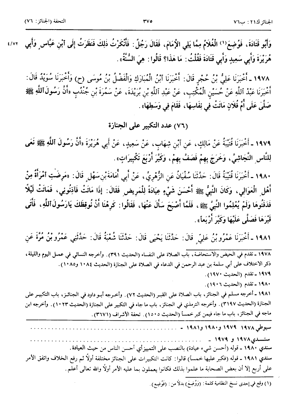 1981 - أَخْبَرَنَا عَمْرُو بْنُ عَلِيٍّ قَالَ حَدَّثَنَا يَحْيَى قَالَ حَدَّثَنَا شُعْبَةُ قَالَ حَدَّثَنِي عَمْرُو بْنُ مُرَّةَ عَنْ ابْنِ أَبِي لَيْلَى أَنَّ زَيْدَ بْنَ أَرْقَمَ صَلَّى عَلَى جَنَازَةٍ فَكَبَّرَ عَلَيْهَا خَمْسًا وَقَالَ كَبَّرَهَا رَسُولُ اللَّهِ صَلَّى اللَّهُ عَلَيْهِ وَسَلَّمَ