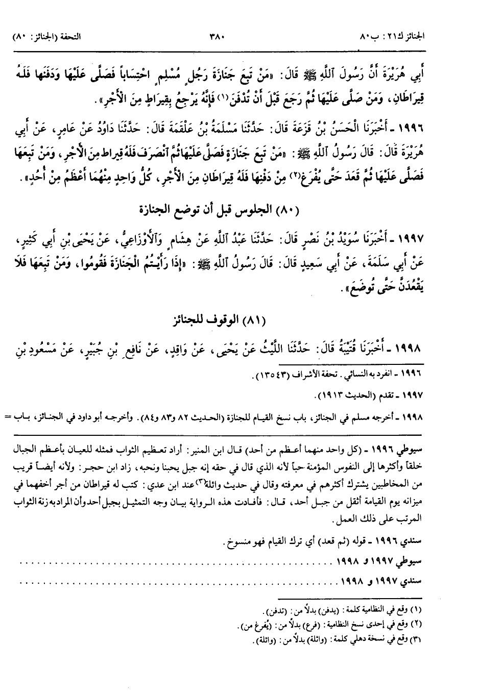 1996 - أَخْبَرَنَا الْحَسَنُ بْنُ قَزَعَةَ قَالَ حَدَّثَنَا مَسْلَمَةُ بْنُ عَلْقَمَةَ قَالَ أَنْبَأَنَا دَاوُدُ عَنْ عَامِرٍ عَنْ أَبِي هُرَيْرَةَ قَالَ قَالَ رَسُولُ اللَّهِ صَلَّى اللَّهُ عَلَيْهِ وَسَلَّمَ مَنْ تَبِعَ جَنَازَةً فَصَلَّى عَلَيْهَا ثُمَّ انْصَرَفَ فَلَهُ قِيرَاطٌ مِنْ الْأَجْرِ وَمَنْ تَبِعَهَا فَصَلَّى عَلَيْهَا ثُمَّ قَعَدَ حَتَّى يُفْرَغَ مِنْ دَفْنِهَا فَلَهُ قِيرَاطَانِ مِنْ الْأَجْرِ كُلُّ وَاحِدٍ مِنْهُمَا أَعْظَمُ مِنْ أُحُدٍ